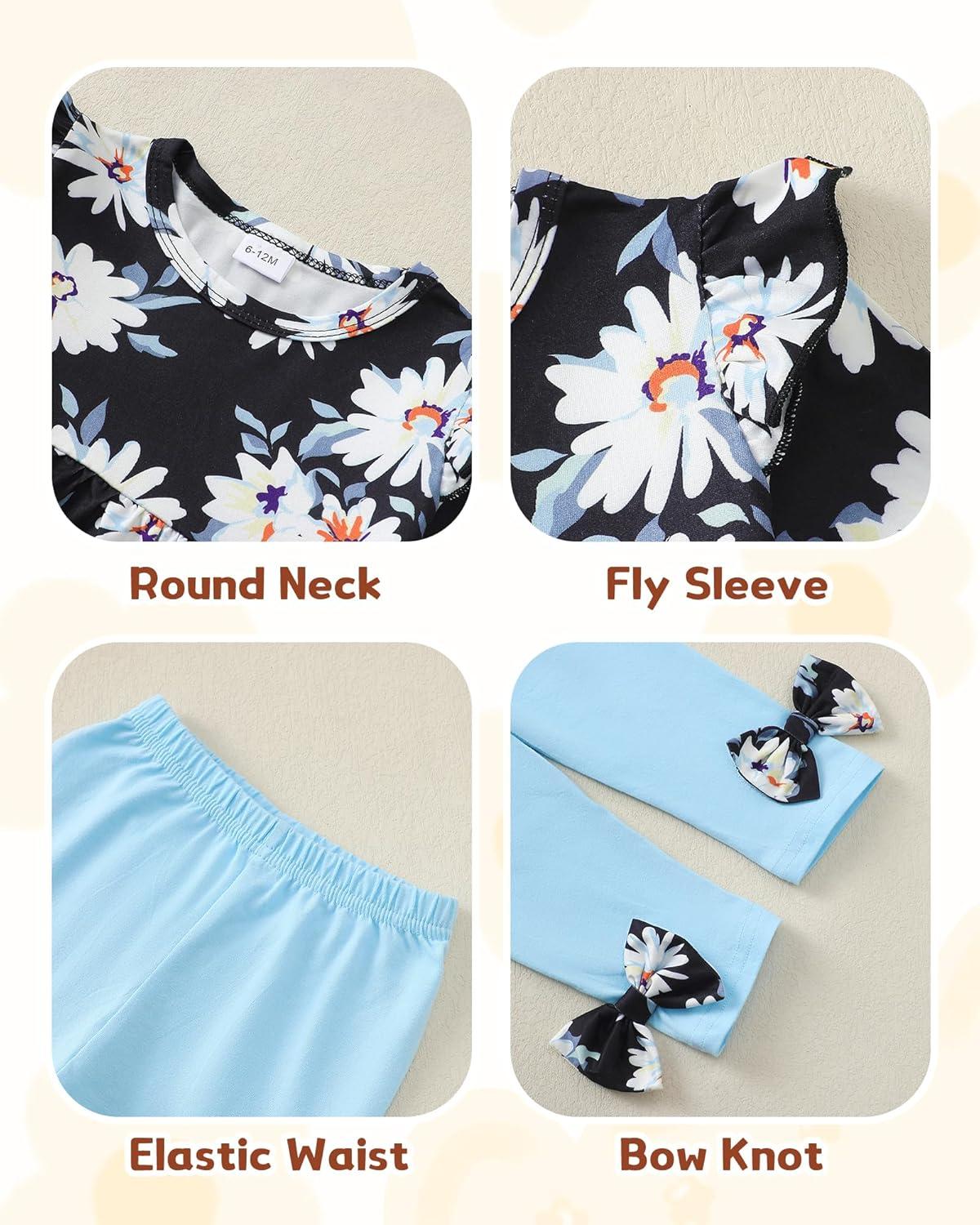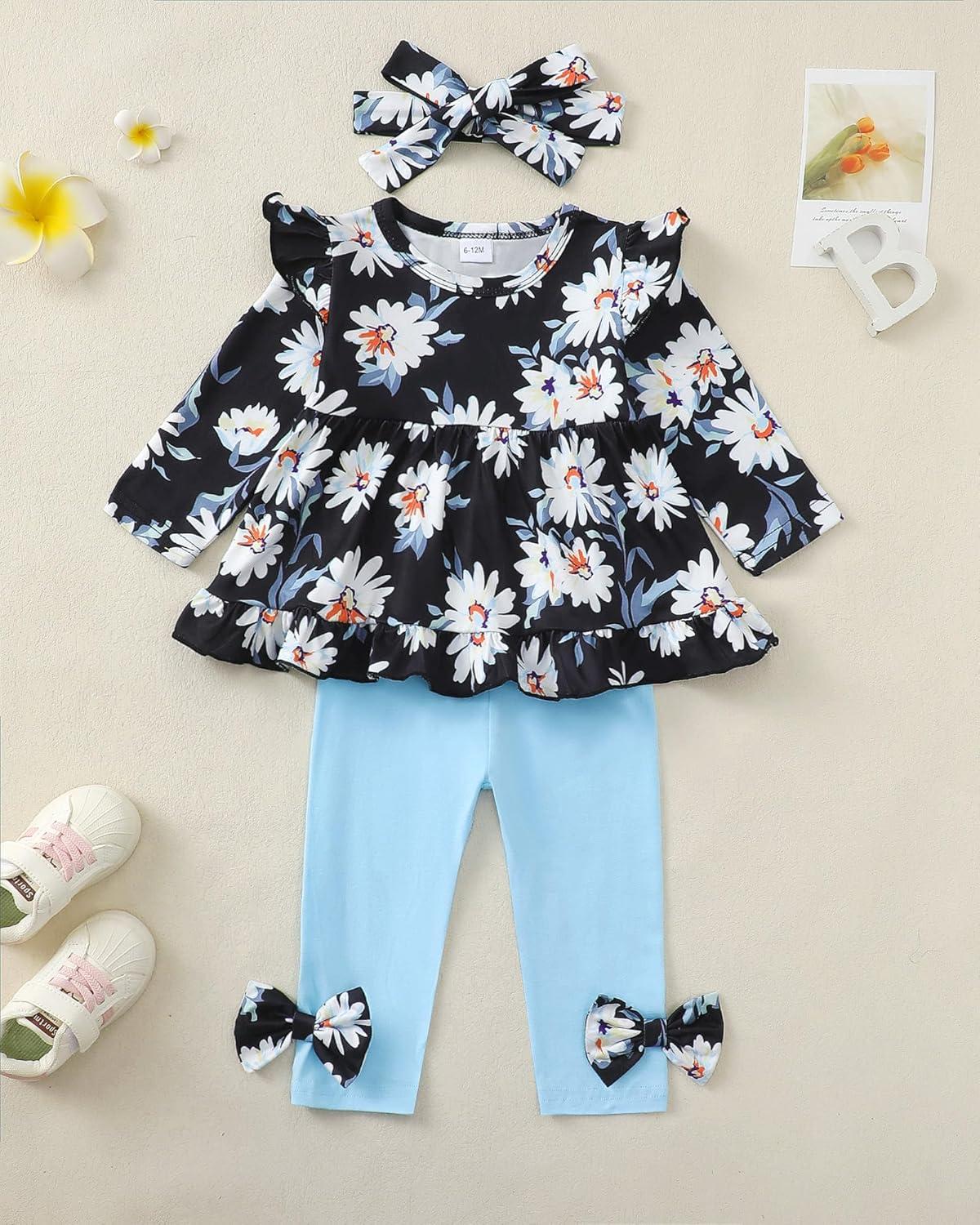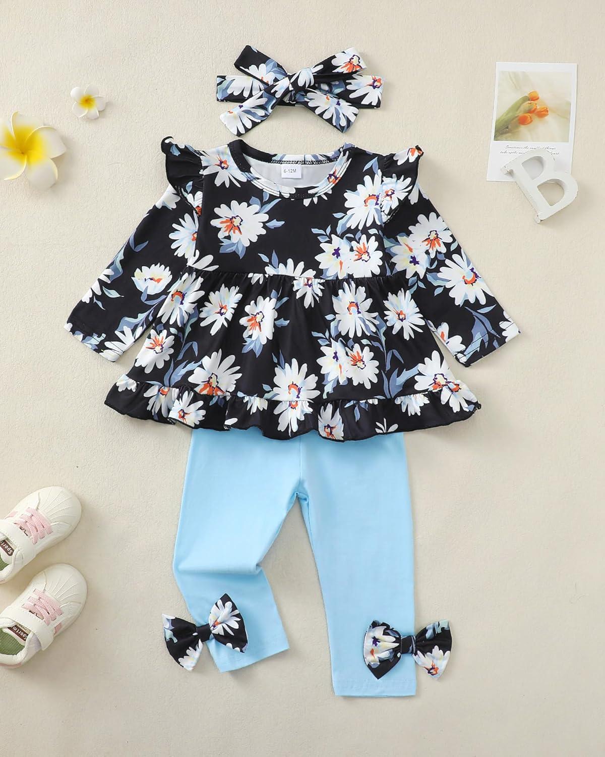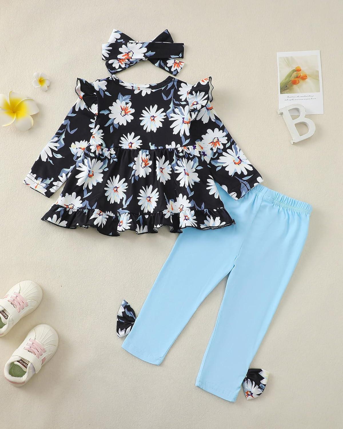 Baby Girl Clothes Toddler Girl Fall Outfits Ruffle Long Sleeve Floral Shirt Tops Winter Leggings Pants Clothing Set(Blue)