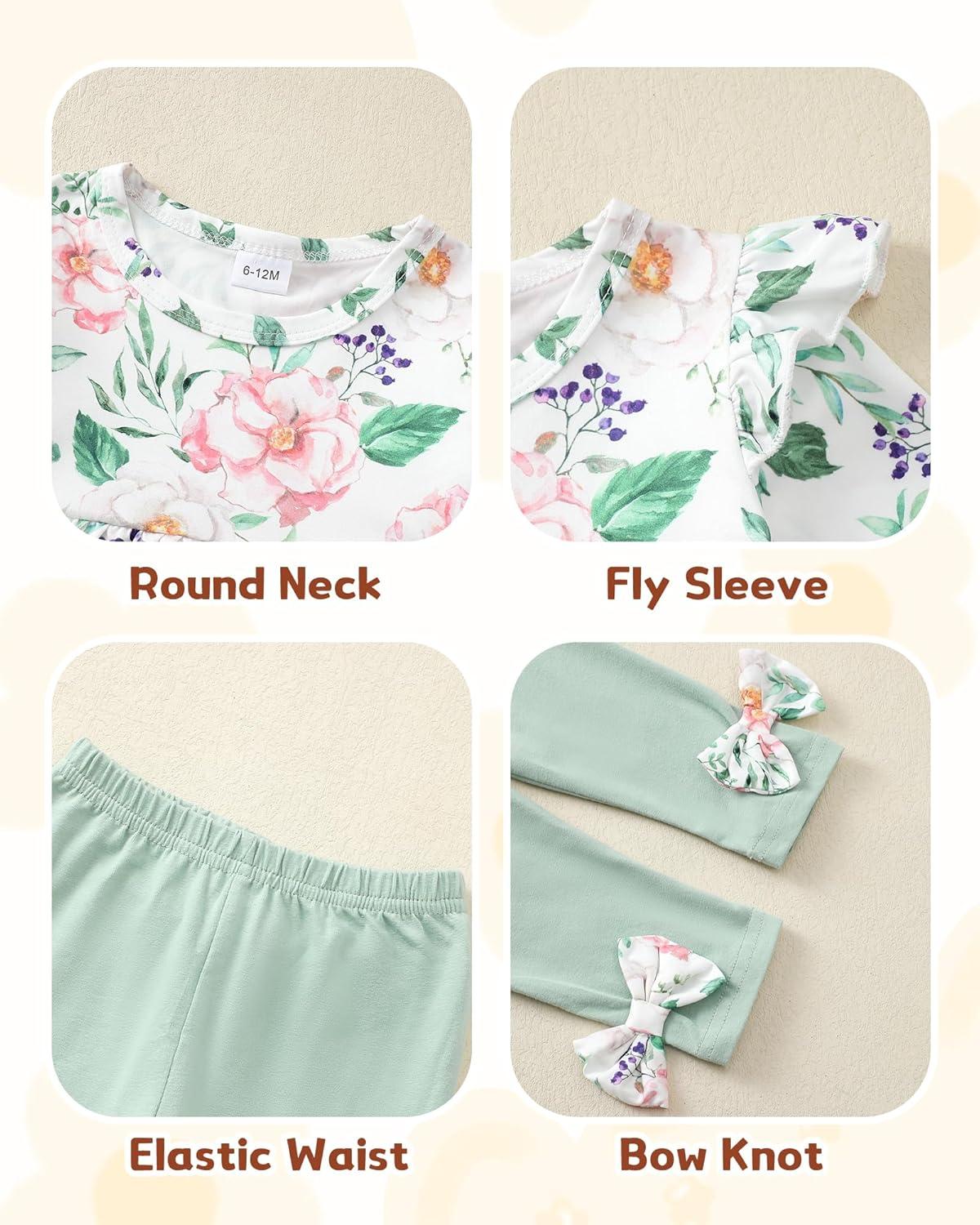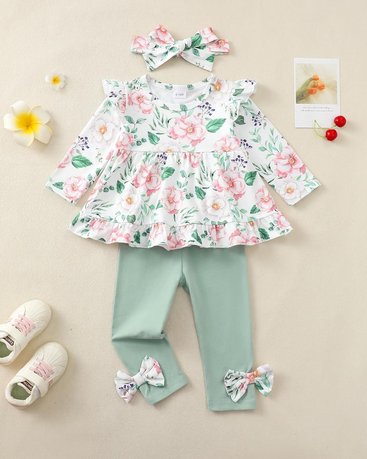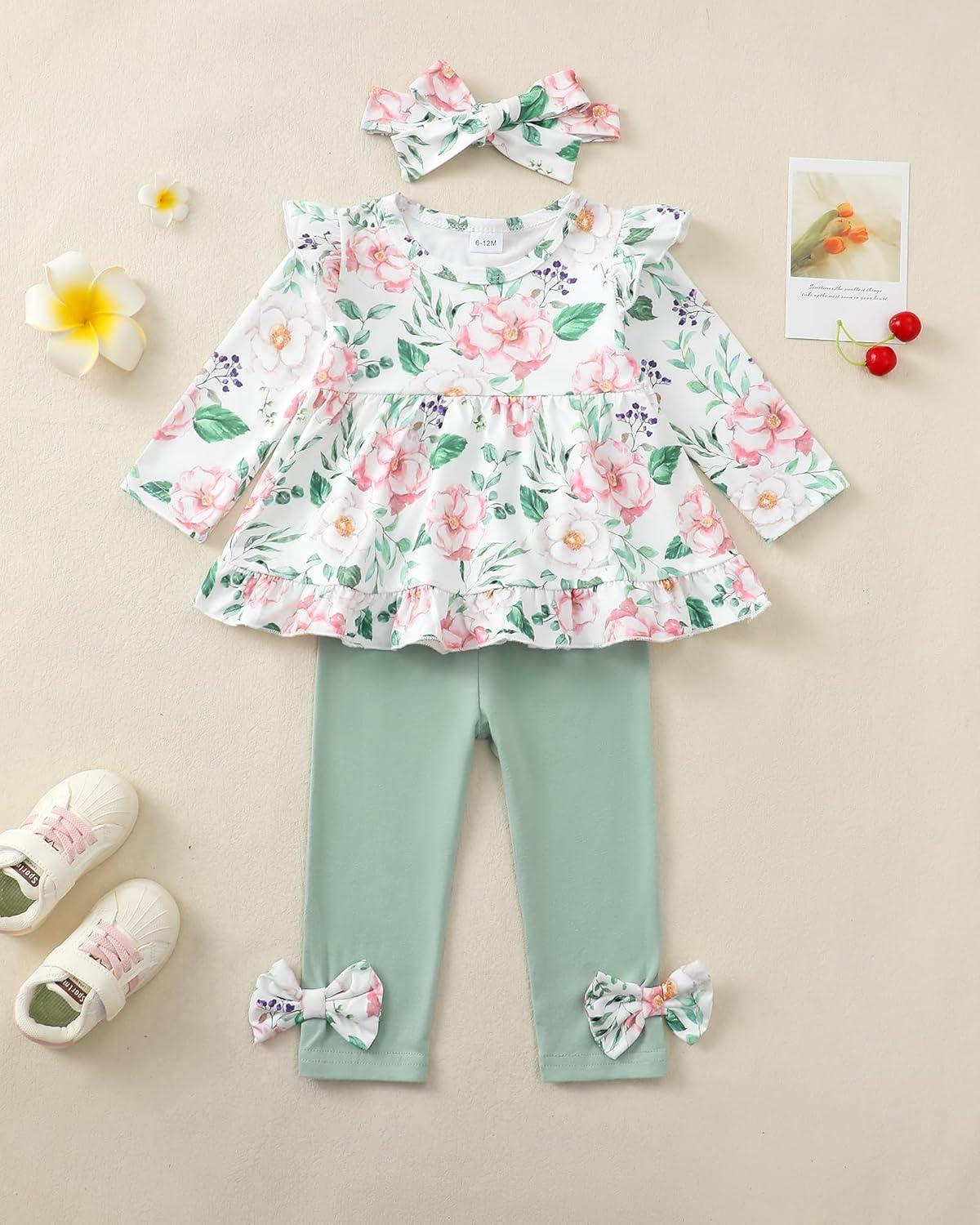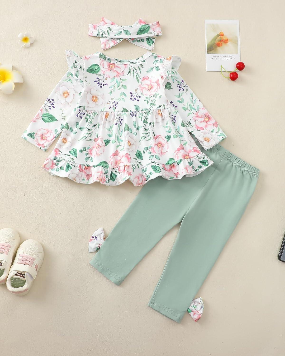 Baby Girl Clothes Toddler Girl Fall Outfits Ruffle Long Sleeve Floral Shirt Tops Winter Leggings Pants Clothing Set(Green Flower)