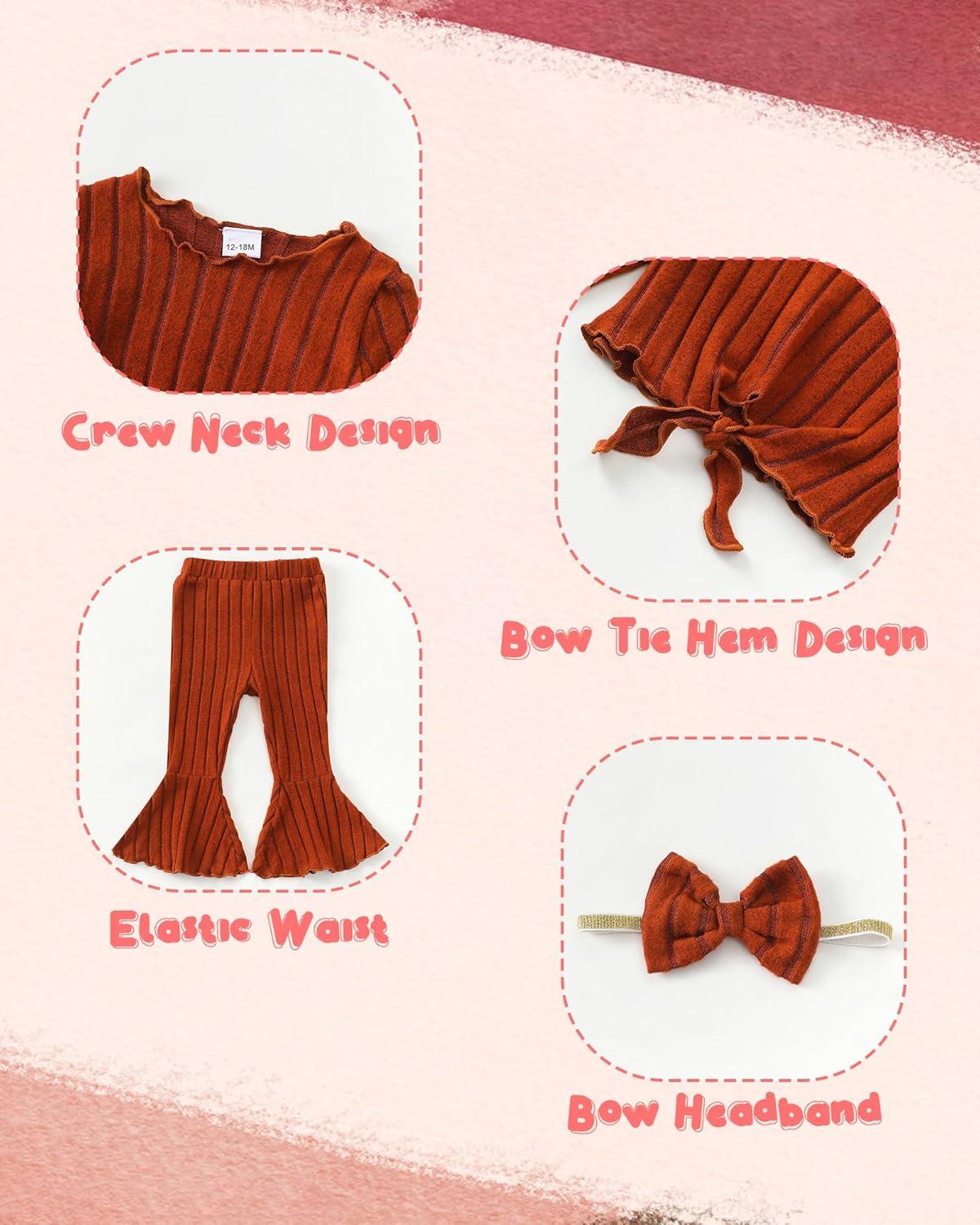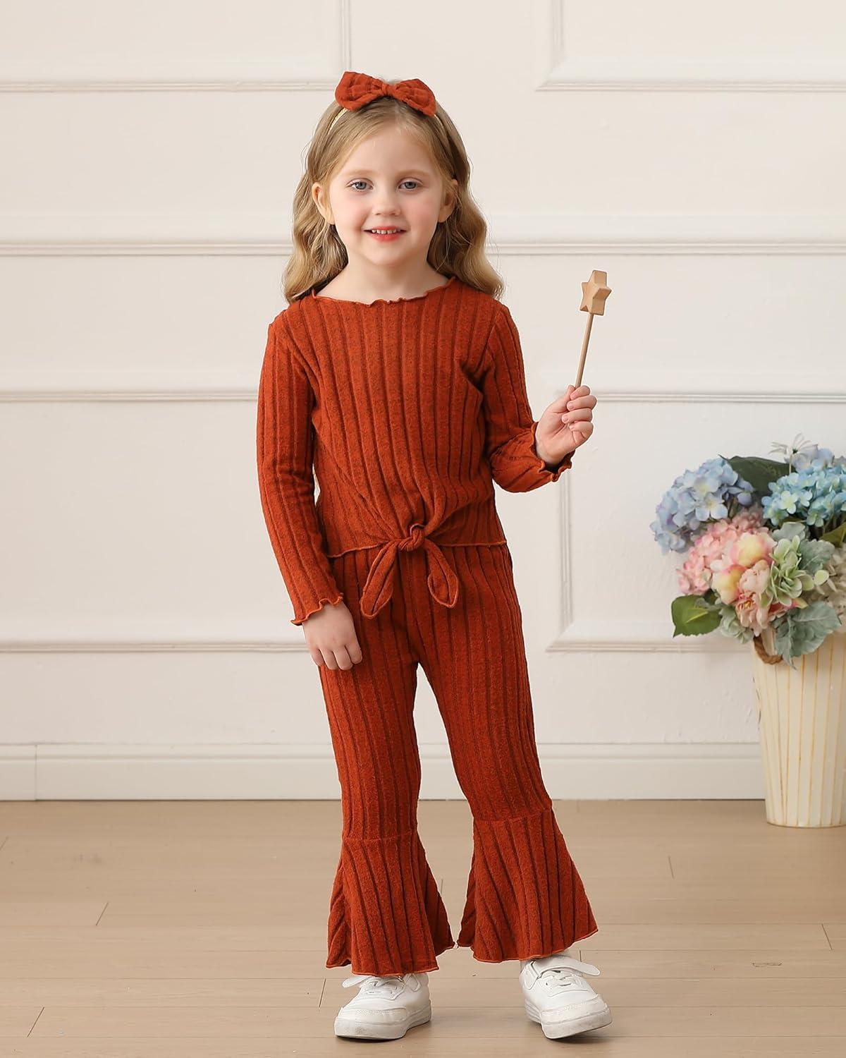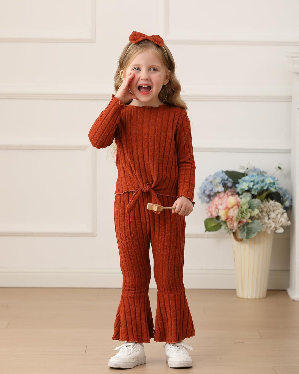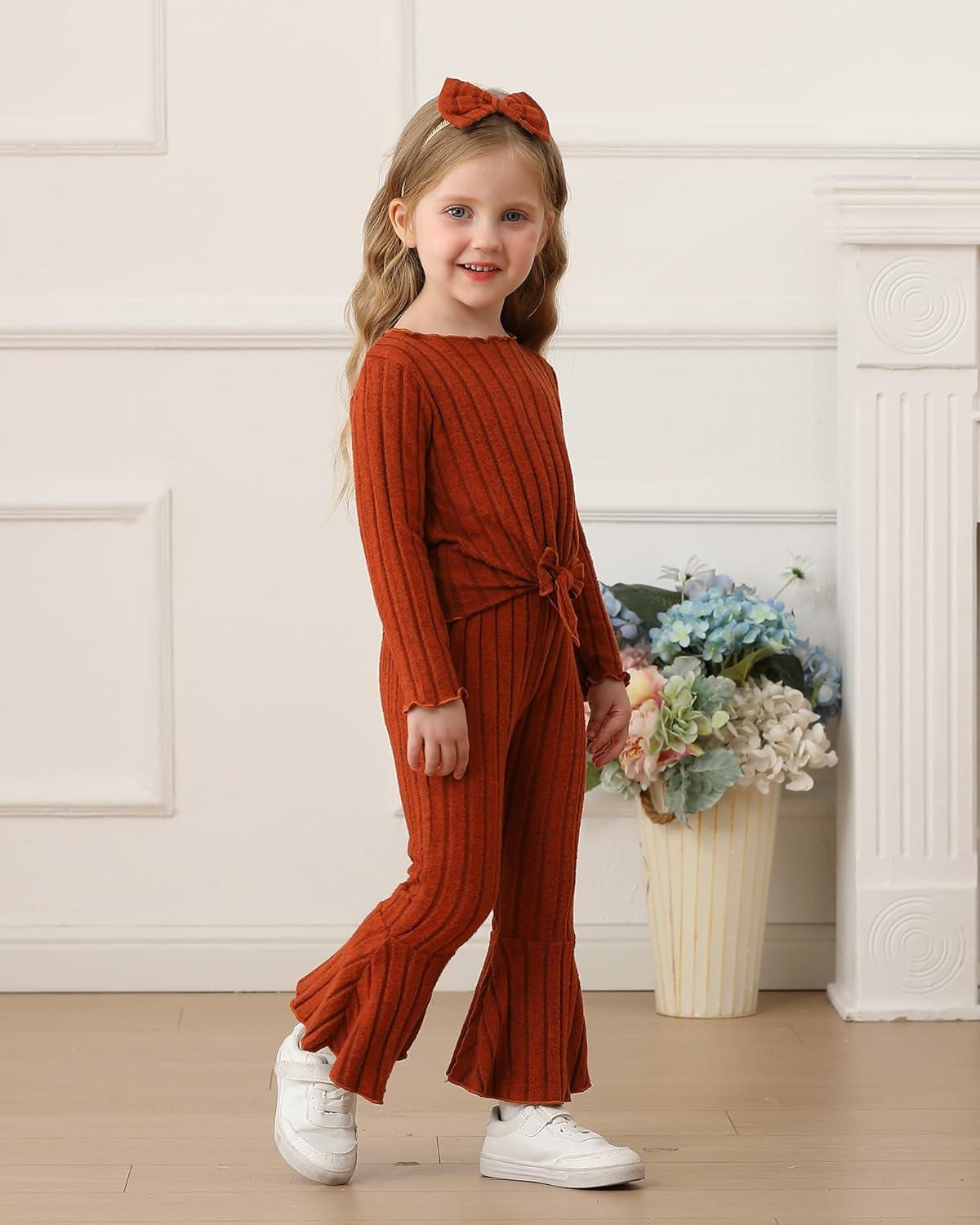 Kucnuzki Baby Girl Clothes Toddler Clothes Long Sleeve Plain Shirts Top Bell Bottoms Flare Pants Infant Girl Fall Outfit(Dark Brown)