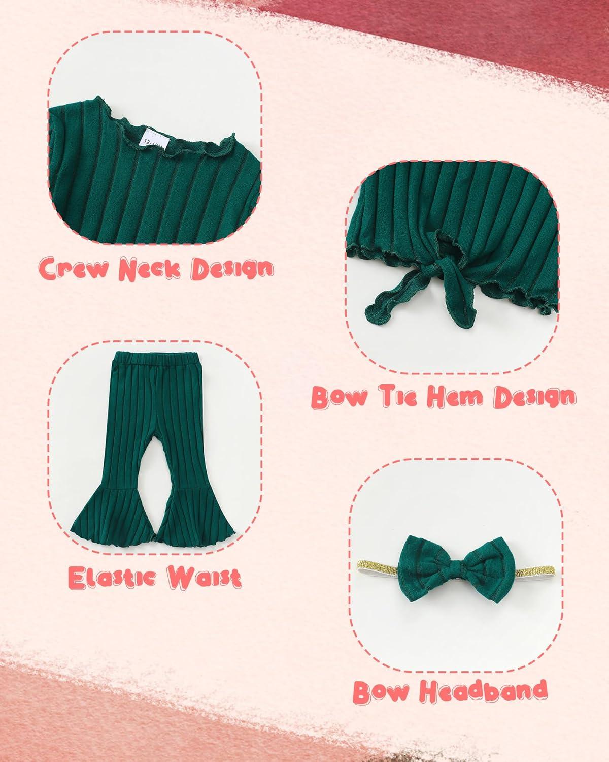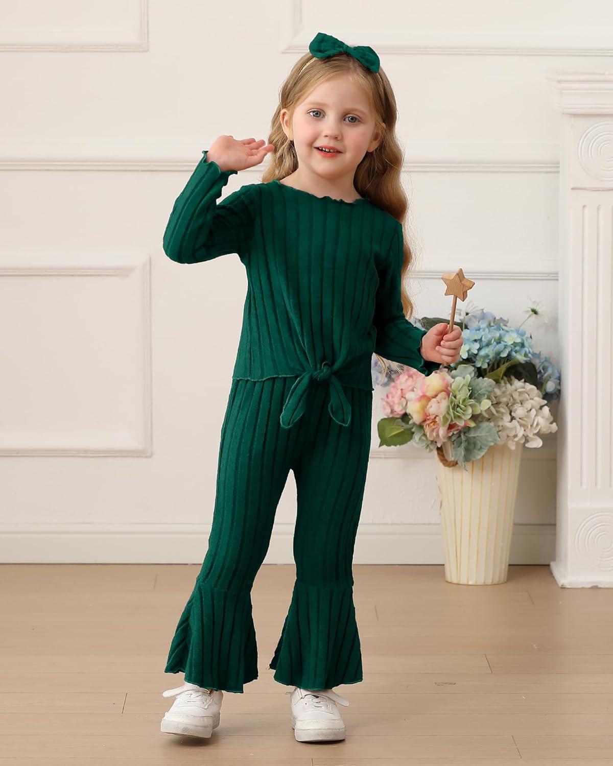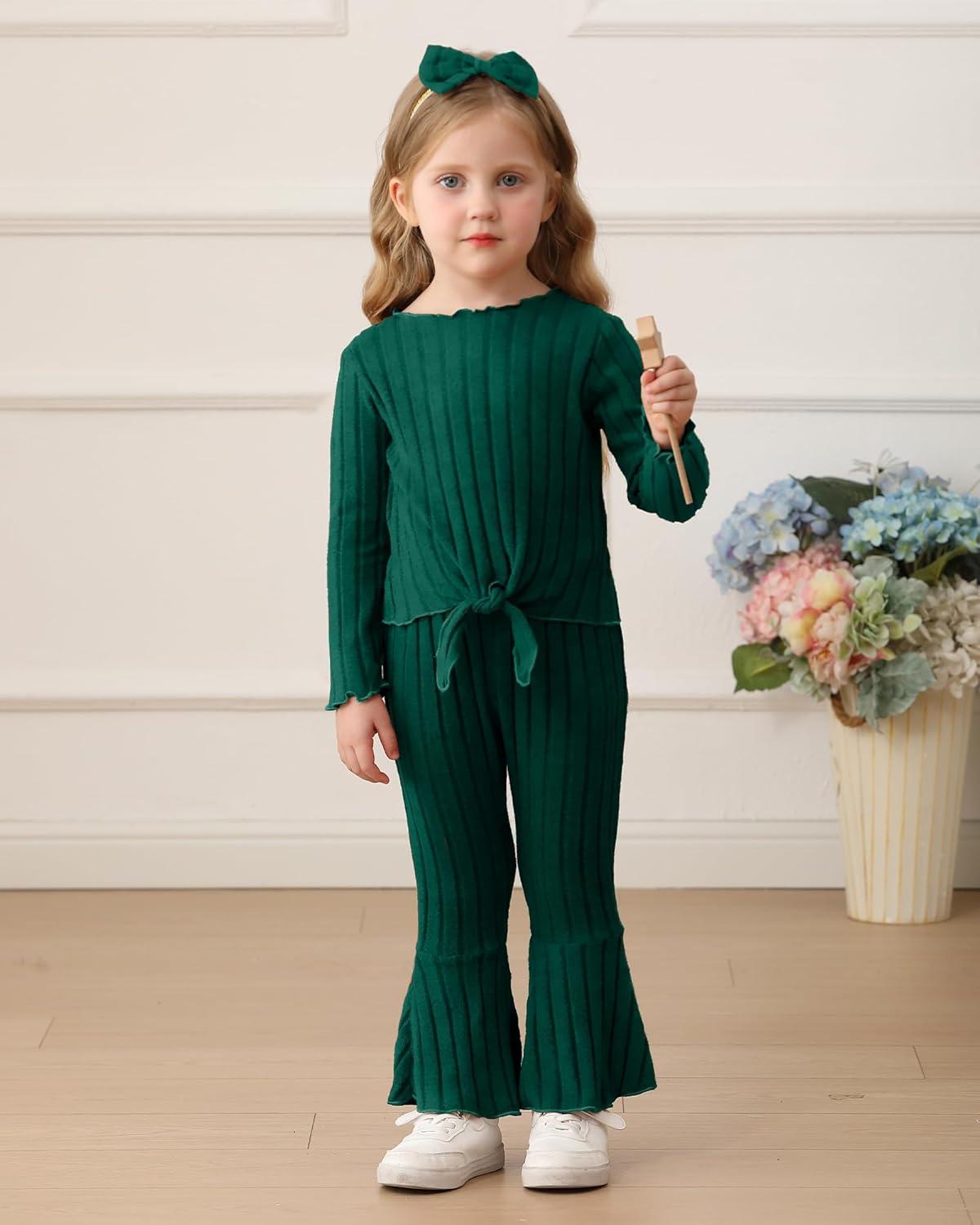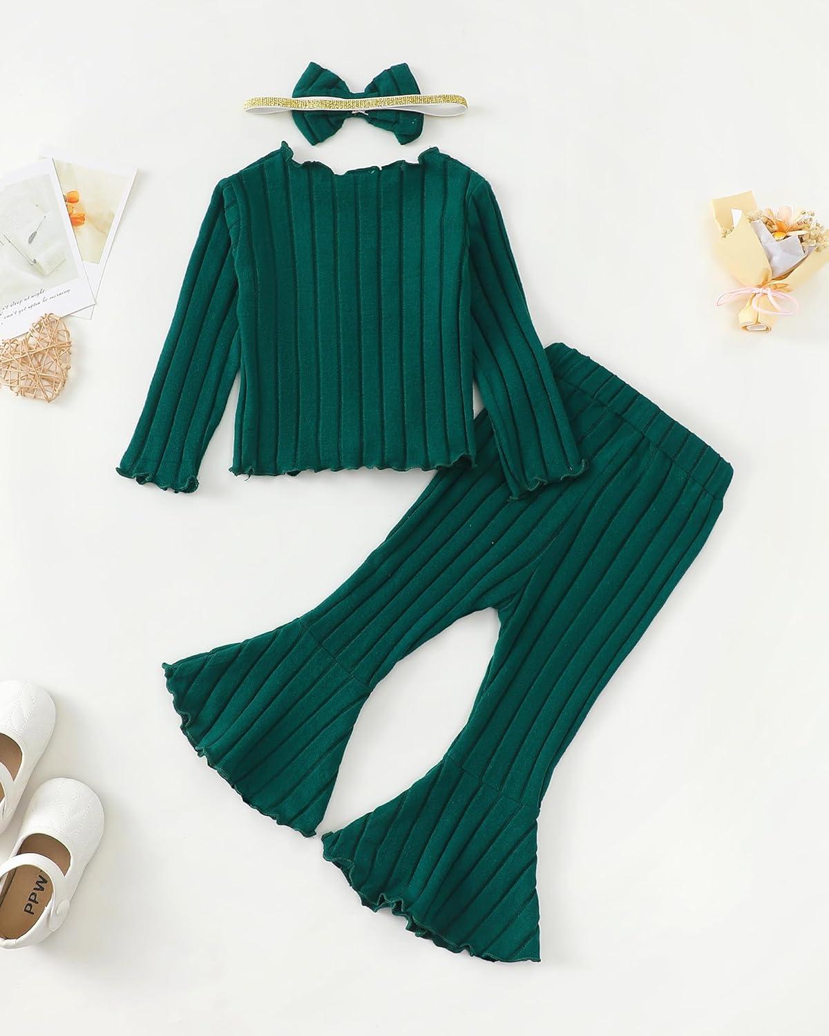 Kucnuzki Baby Girl Clothes Toddler Clothes Long Sleeve Plain Shirts Top Bell Bottoms Flare Pants Infant Girl Fall Outfit(Dark Green)