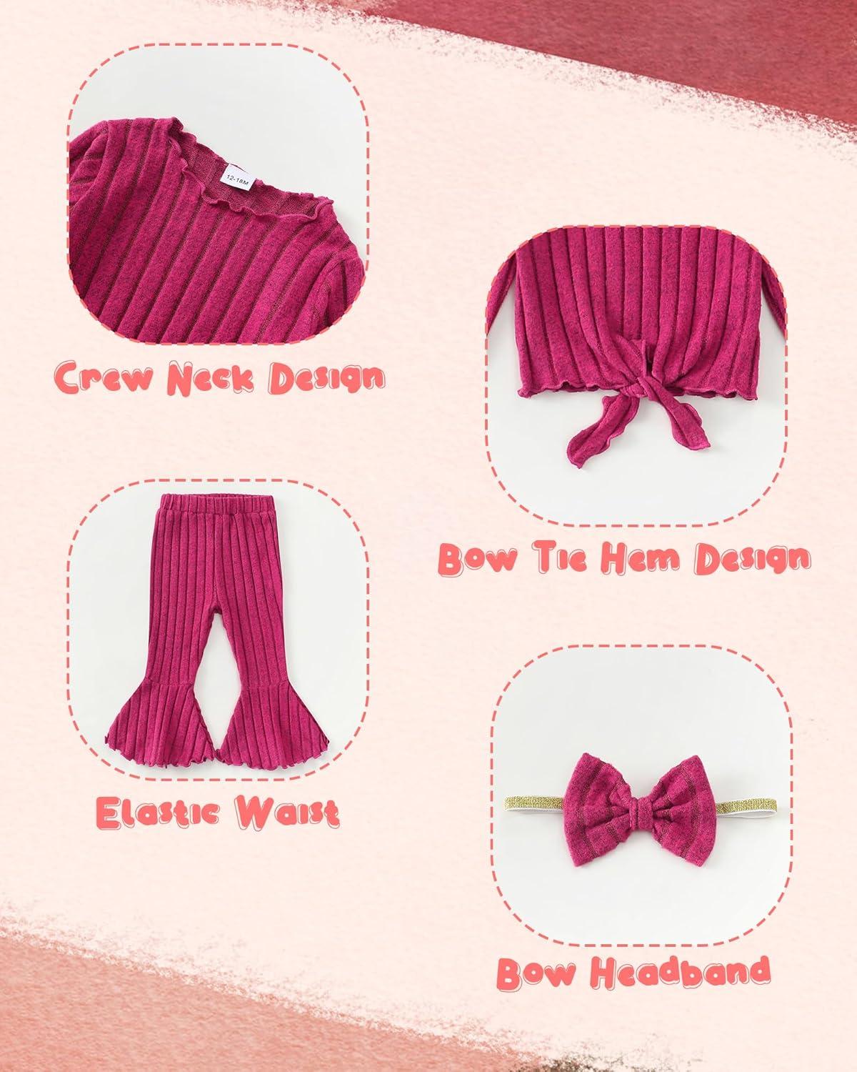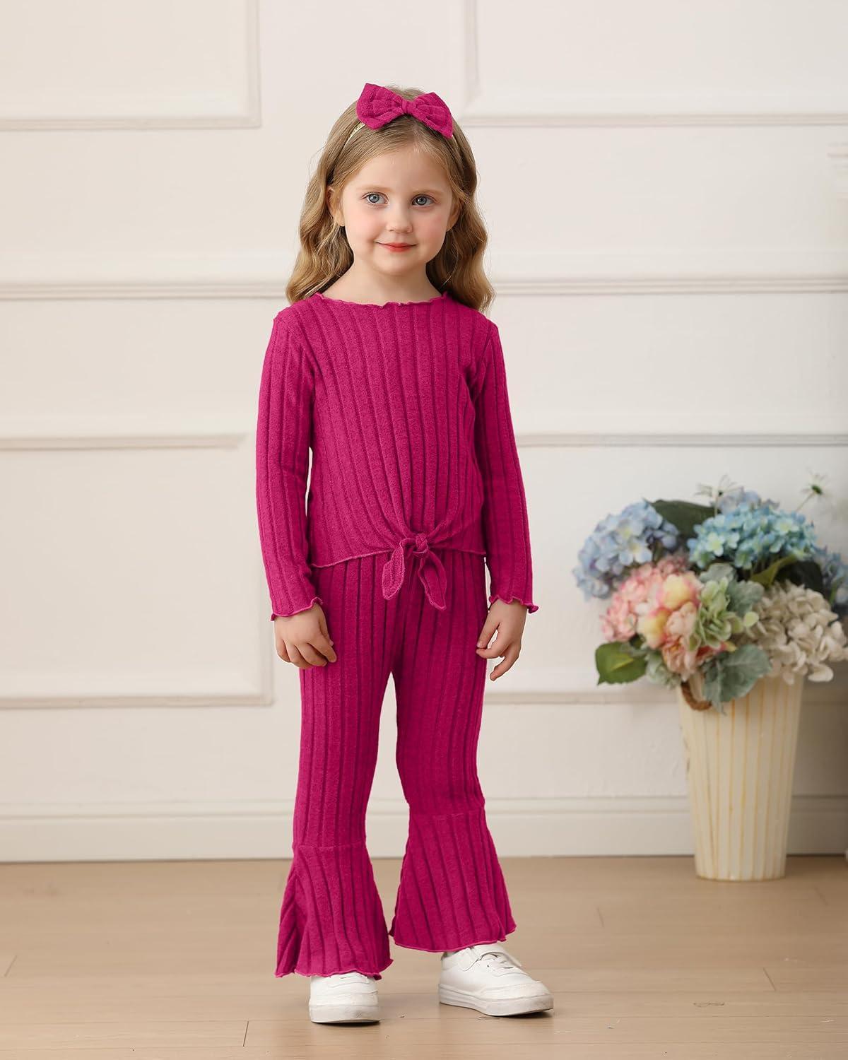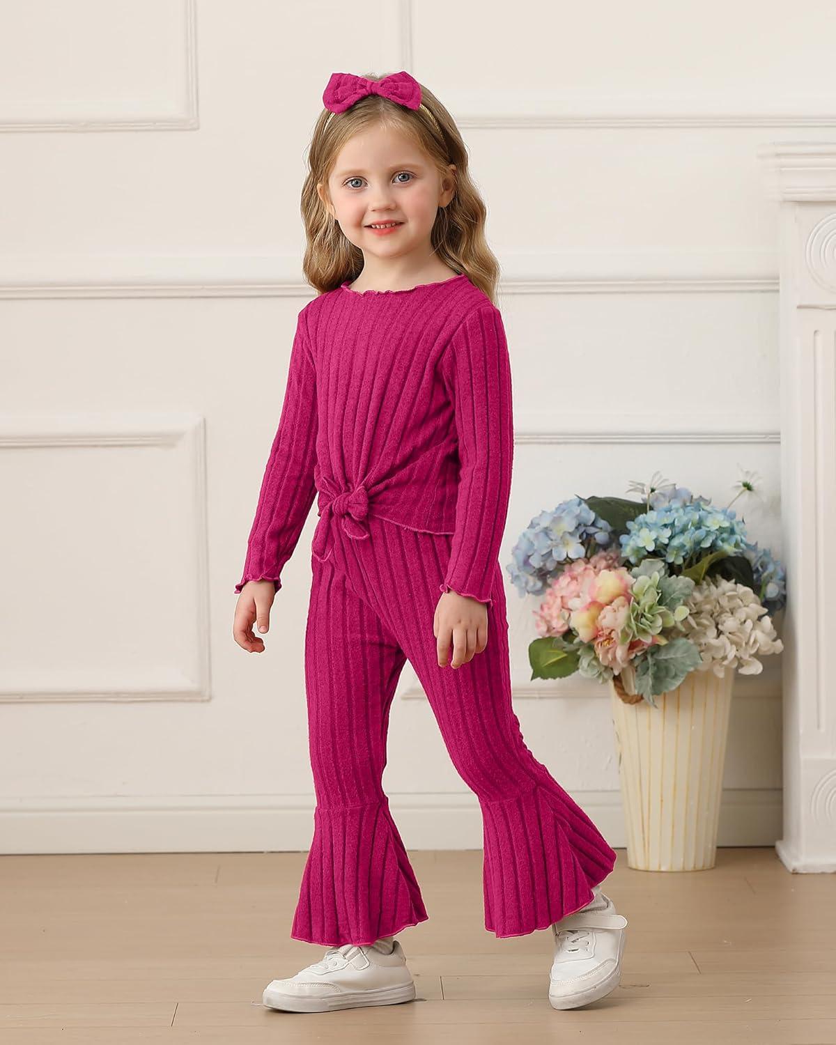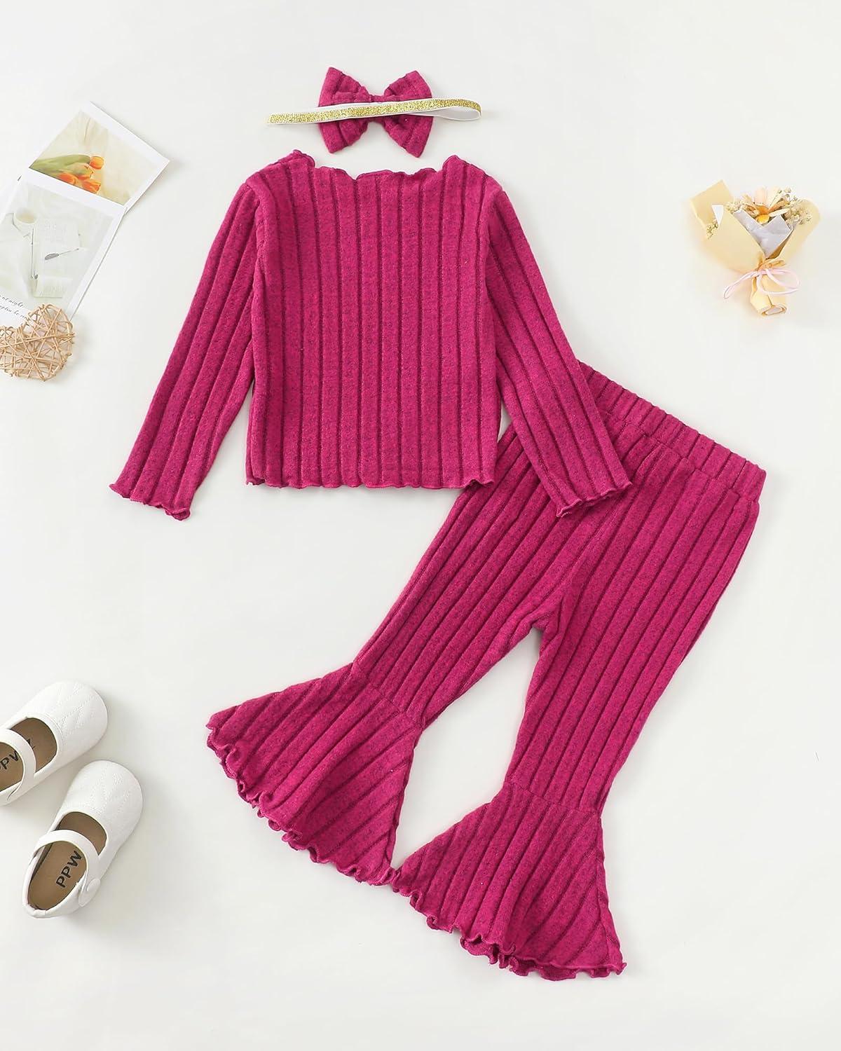 Kucnuzki Baby Girl Clothes Toddler Clothes Long Sleeve Plain Shirts Top Bell Bottoms Flare Pants Infant Girl Fall Outfit(Rose)