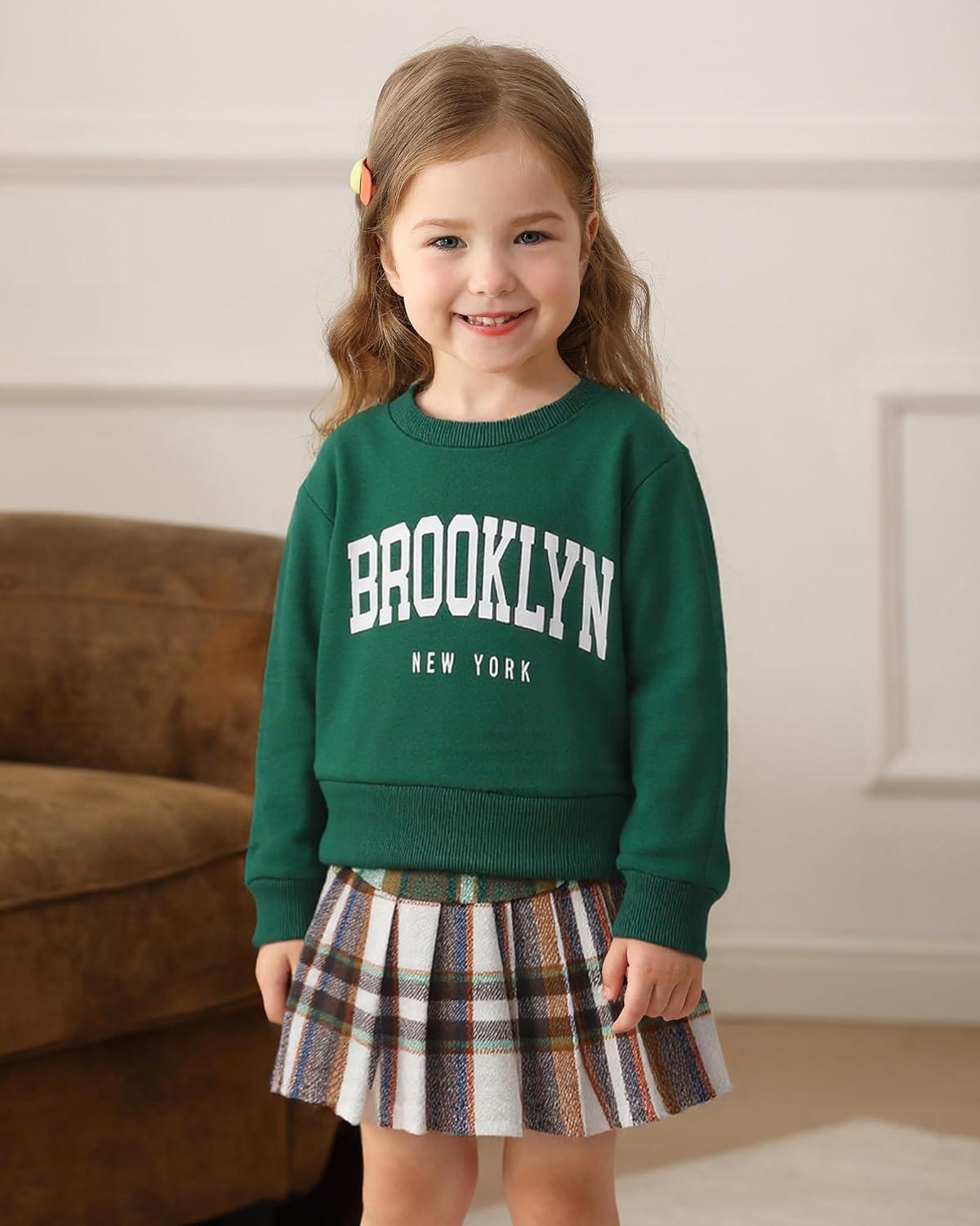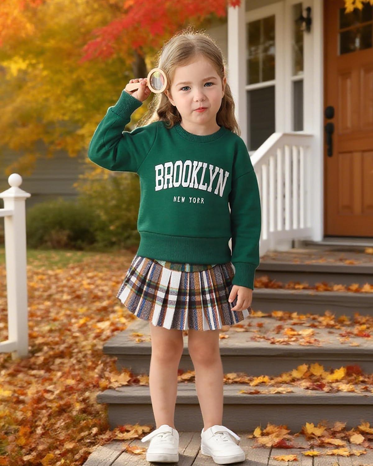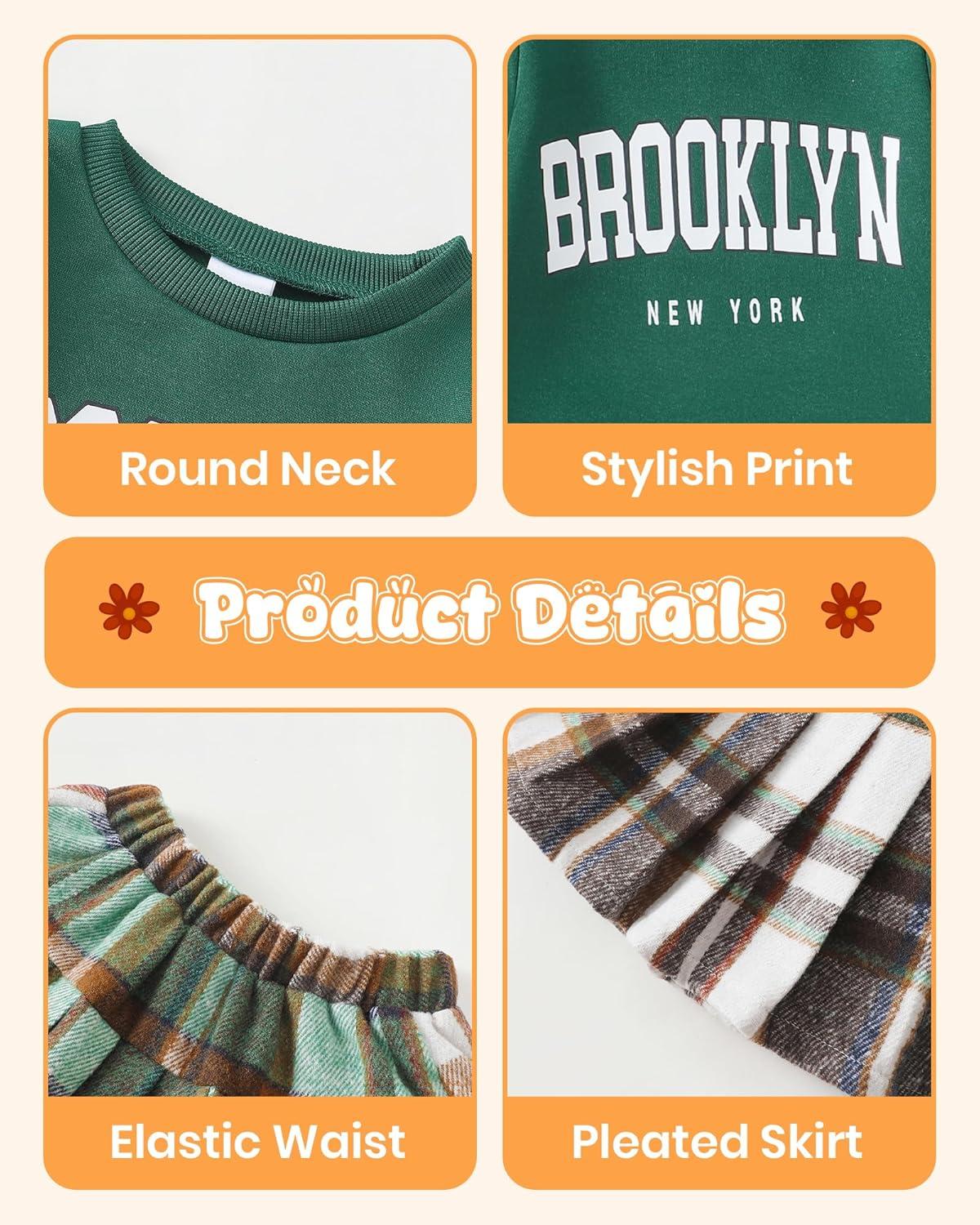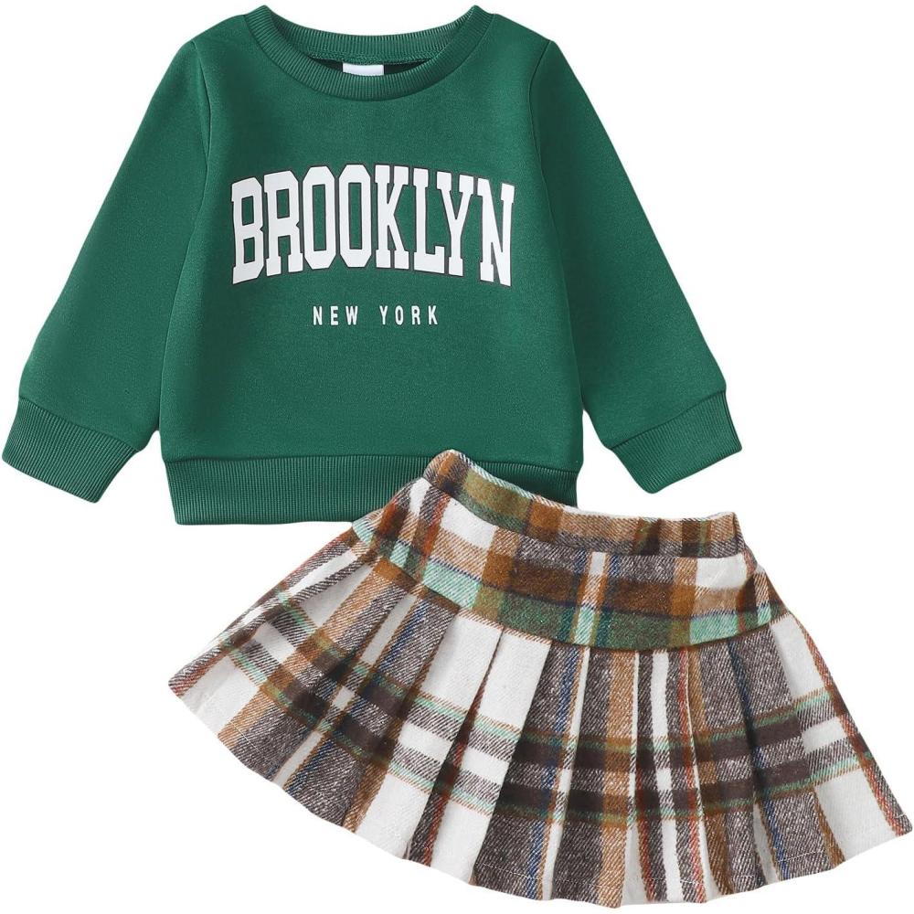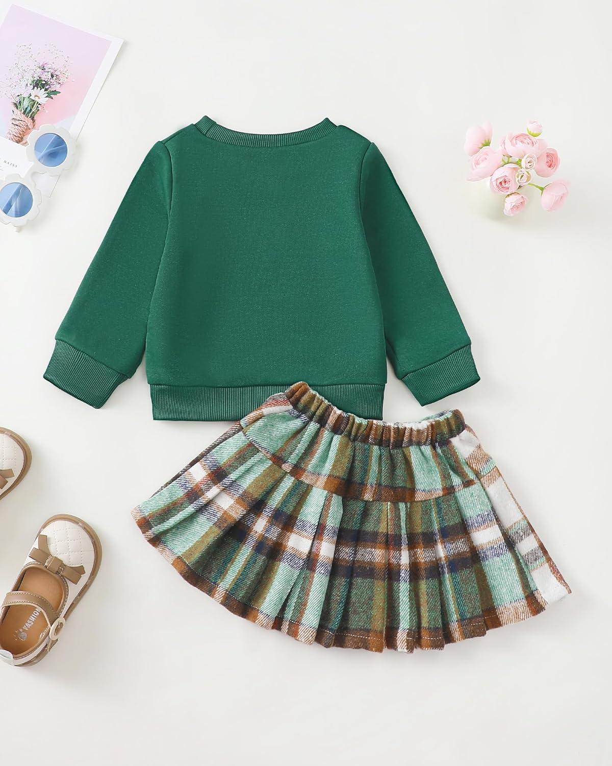 Kucnuzki Baby Girl Clothes Toddler Girl Fall Outfits Kids Winter Cute Long Sleeve T Shirt Top Plaid Mini Skirt Dress Set(Dark Green)