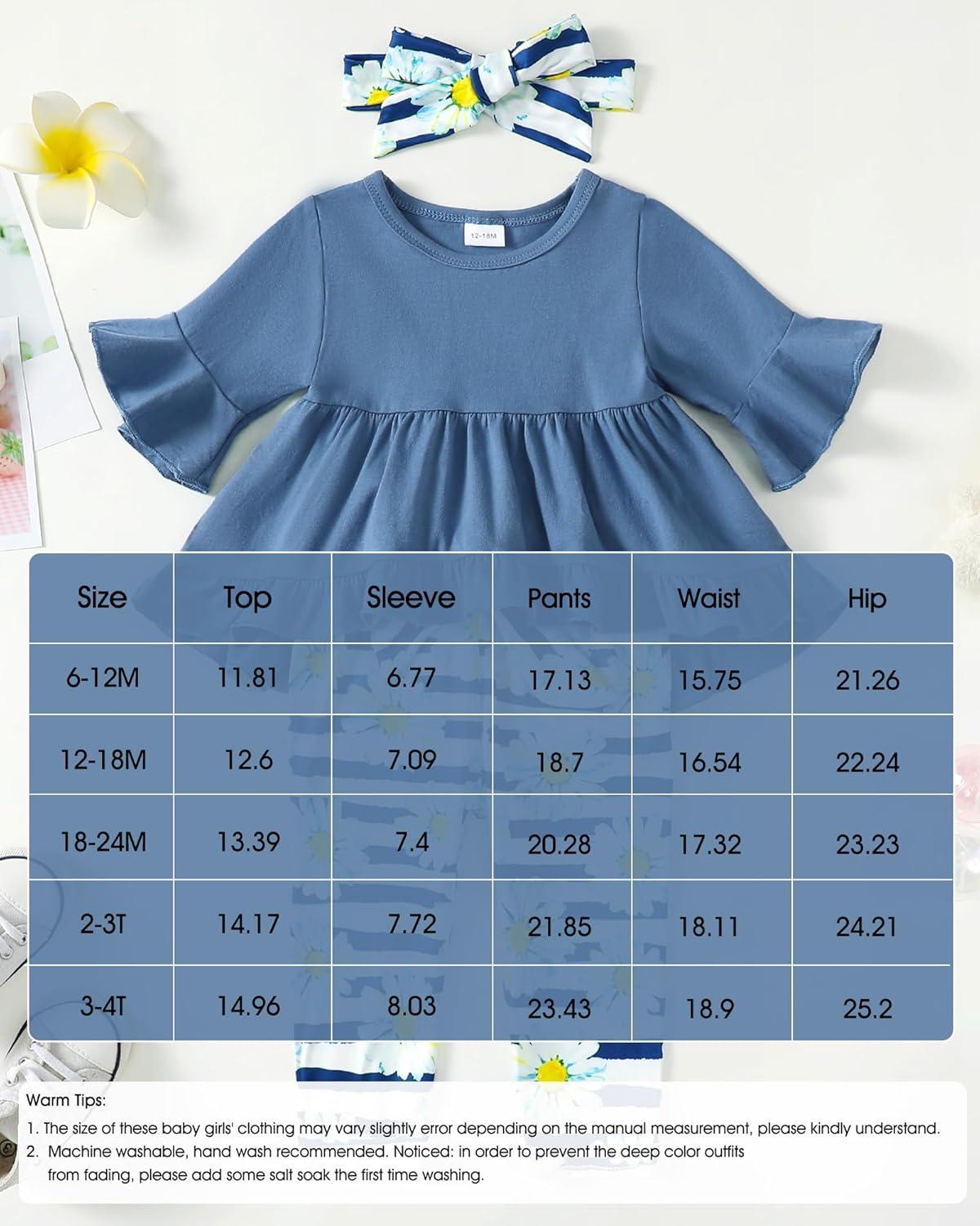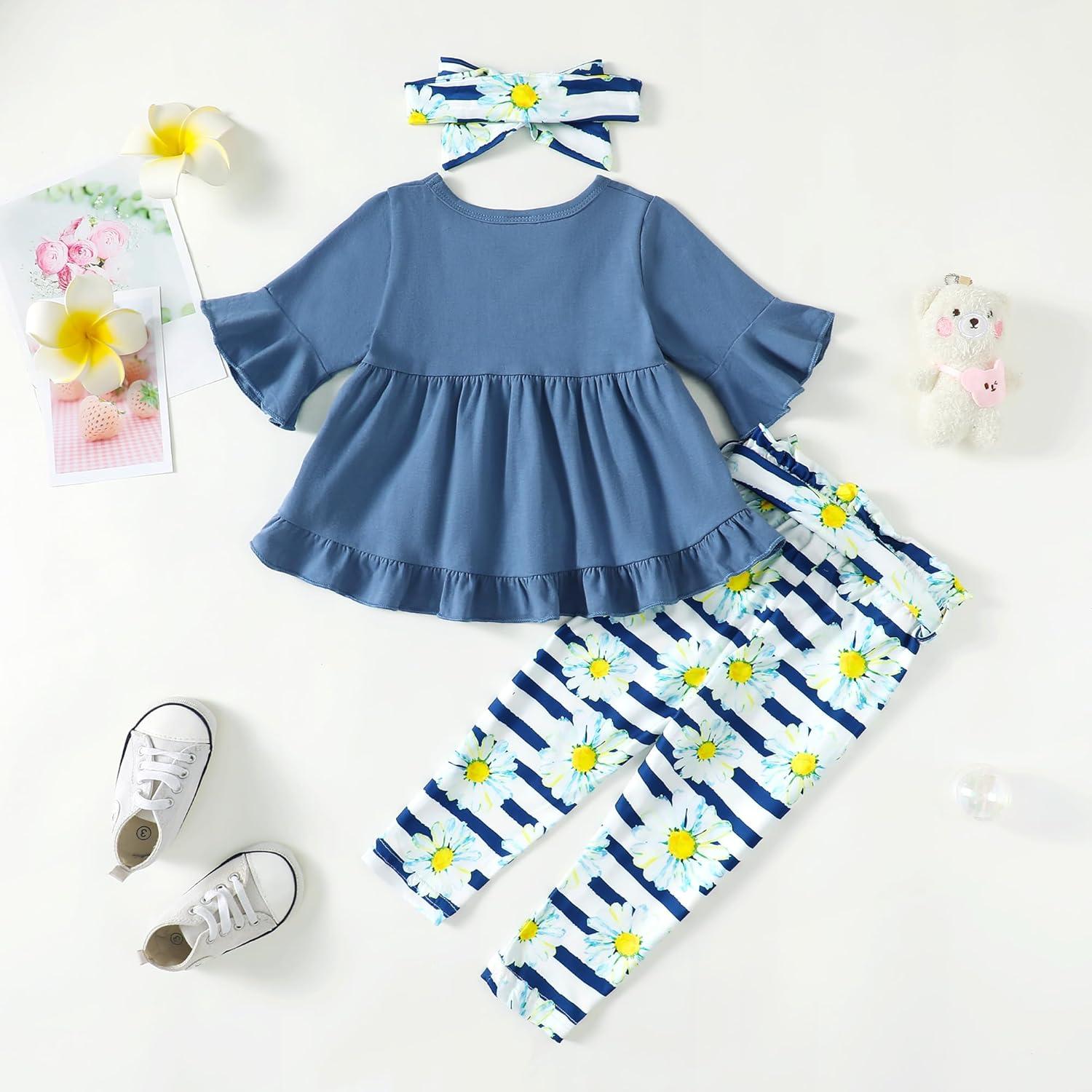 Kucnuzki Baby Girl Clothes Toddler Girl Outfit Ruffle Sleeve Shirt Floral Pant Set Fall Winter Clothing for Girl(Blue-sl)