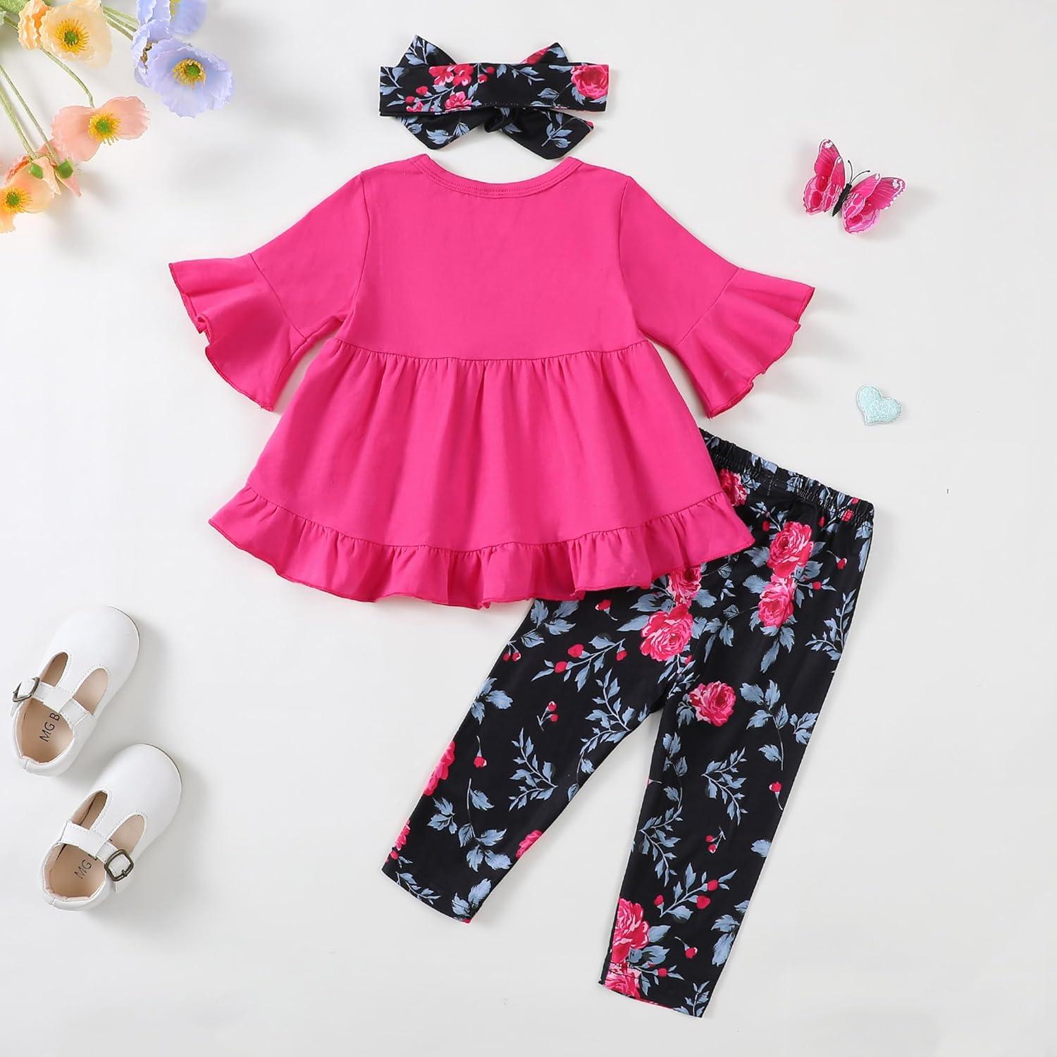 Kucnuzki Baby Girl Clothes Toddler Girl Outfit Ruffle Sleeve Shirt Floral Pant Set Fall Winter Clothing for Girl(Hotpink-sl)