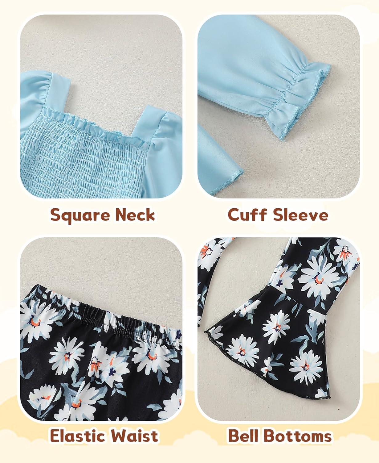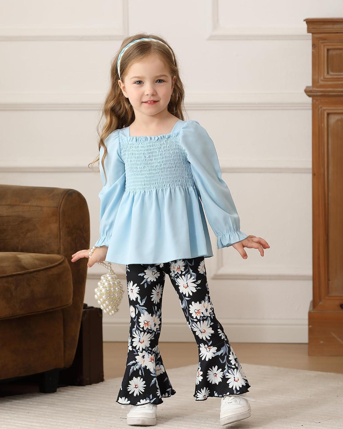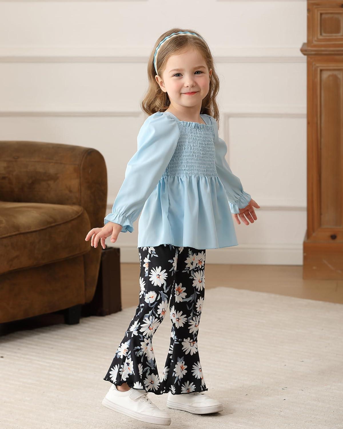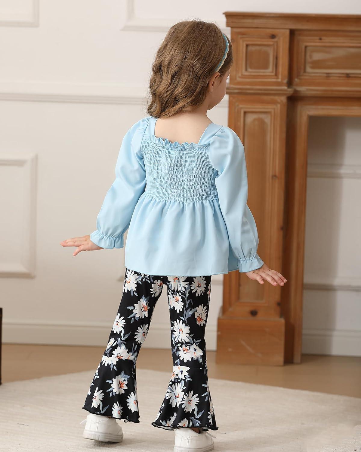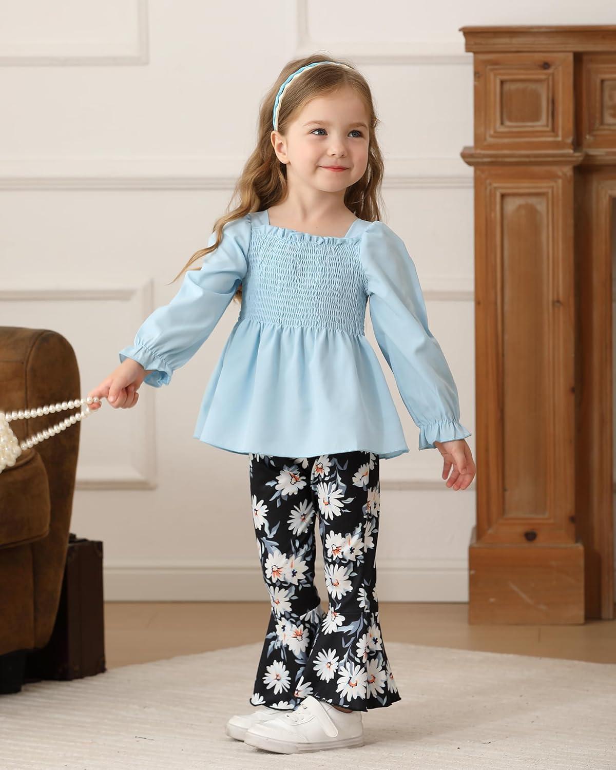 Kucnuzki Baby Girl Clothes Toddler Girl Outfits Fall Winter Long Sleeve T Shirts Top Flare Leggings Pants Kids Clothing(Blue Black)