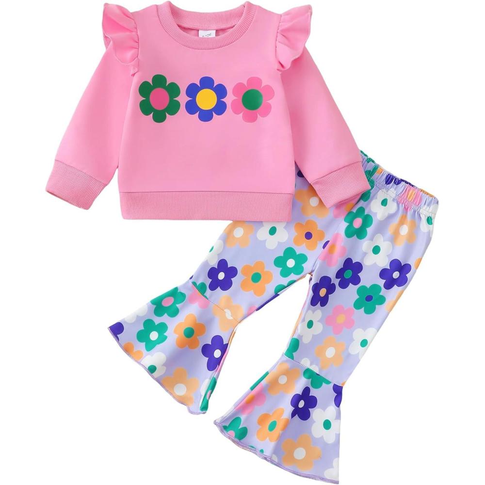 Kucnuzki Baby Girl Clothes Toddler Girl Outfits Fall Winter Long Sleeve T Shirts Top Flare Leggings Pants Kids Clothing(Rose)