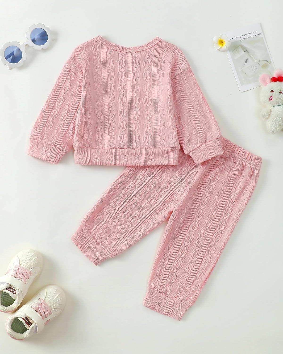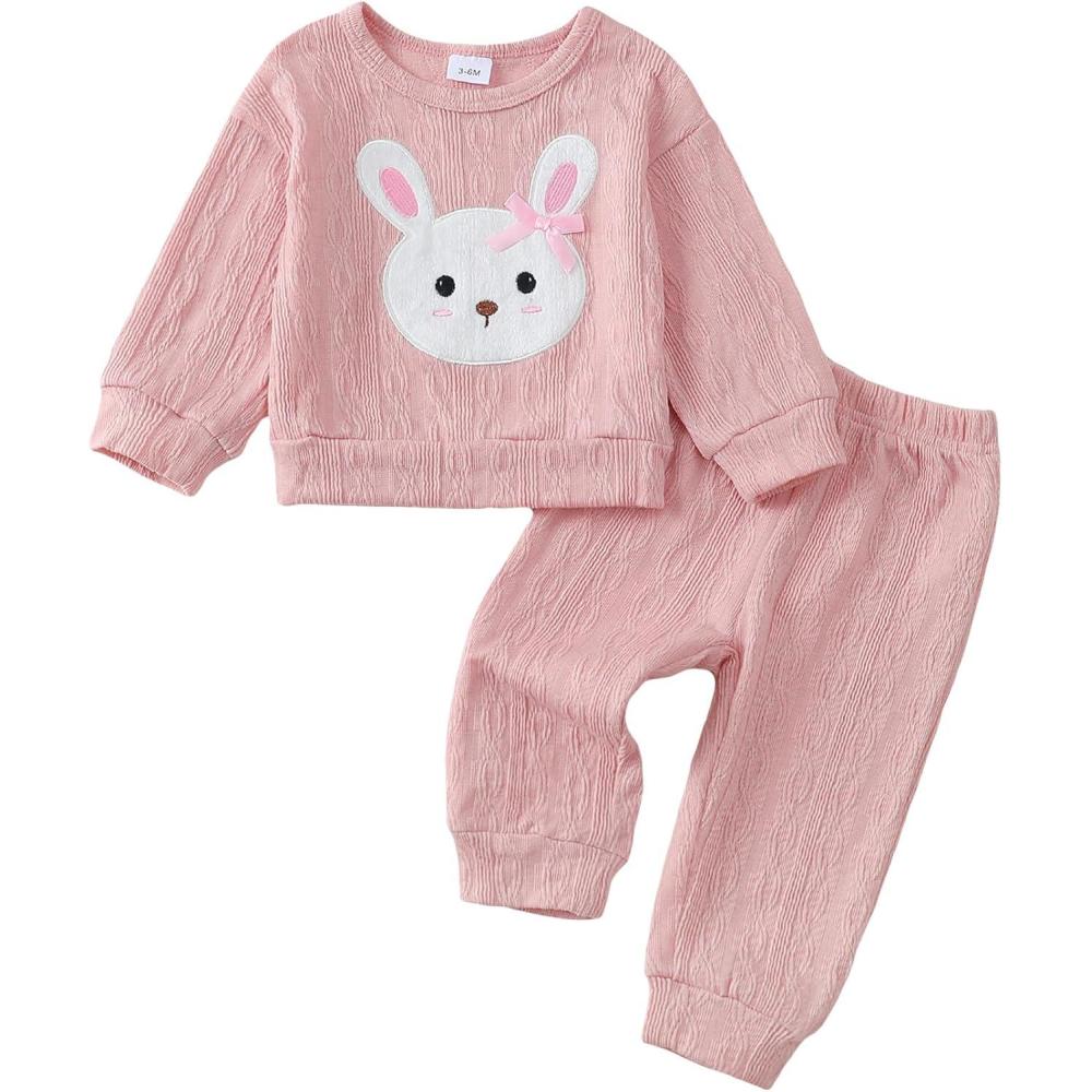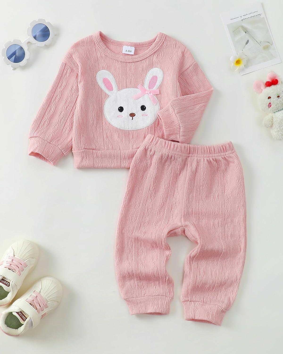 Kucnuzki Baby Toddler Girl Clothes Long Sleeve Crewneck Sweatshirt Tops Sweatpant Sweatsuit Baby Girl Fall Winter Outfit(Pink Rabbit)