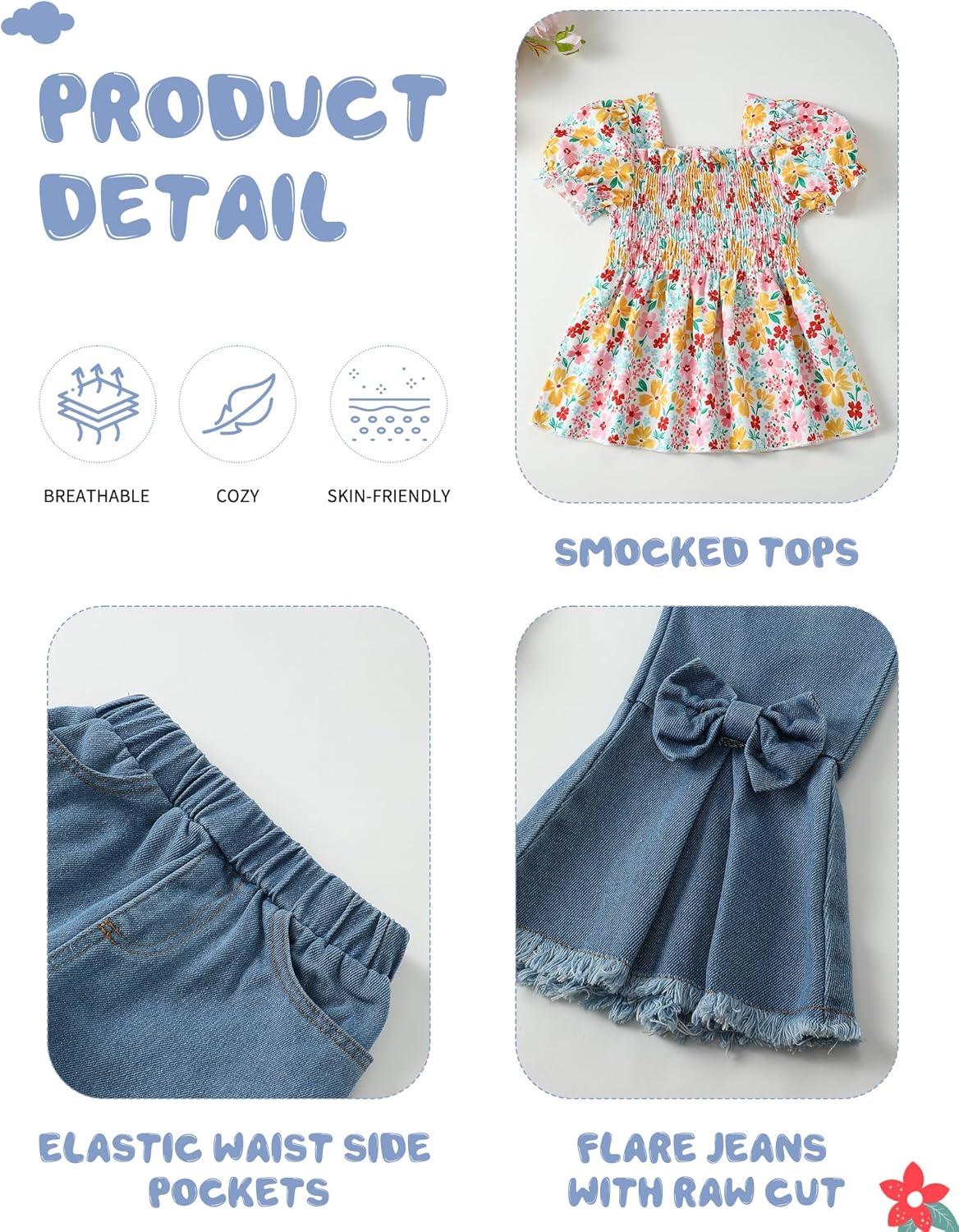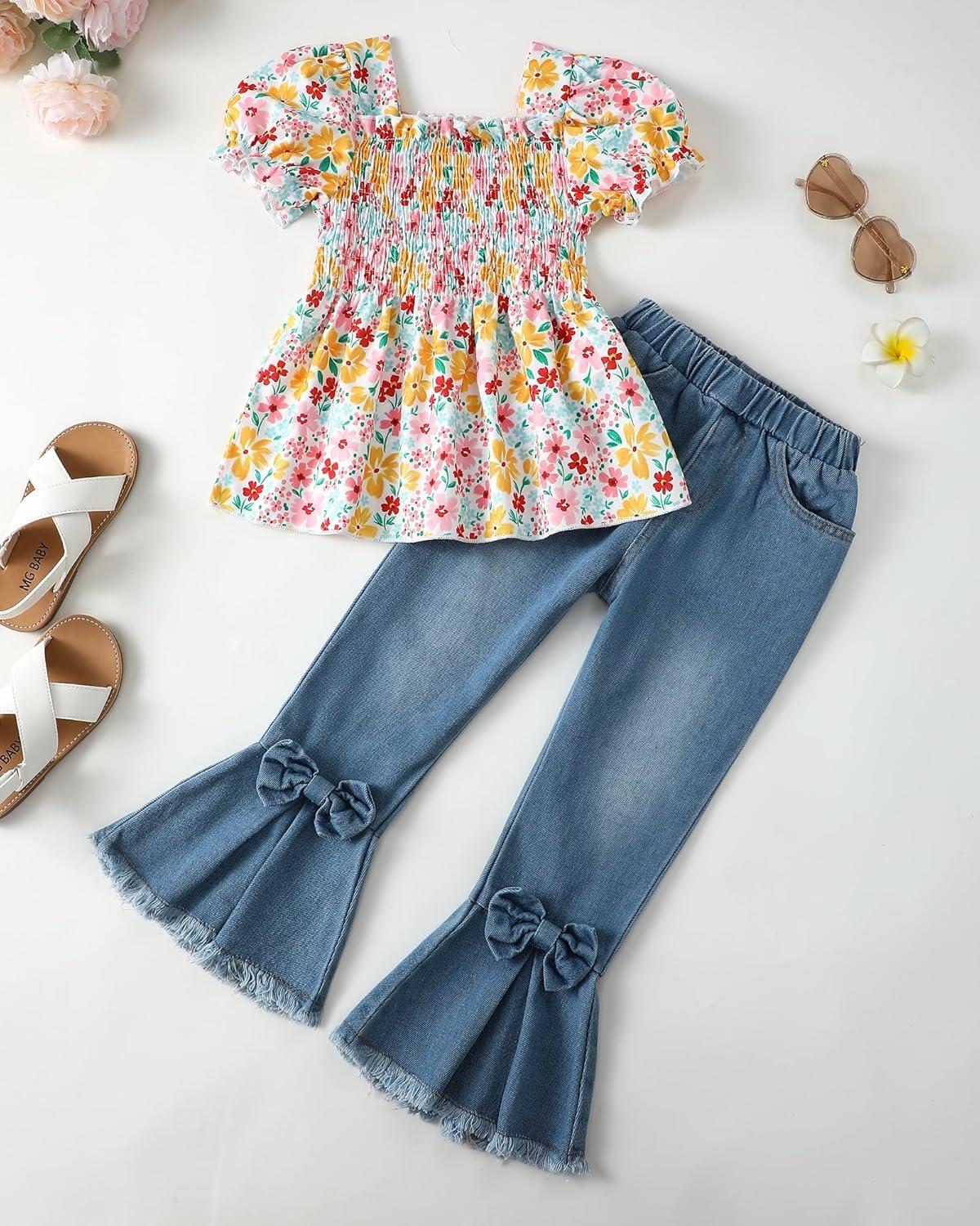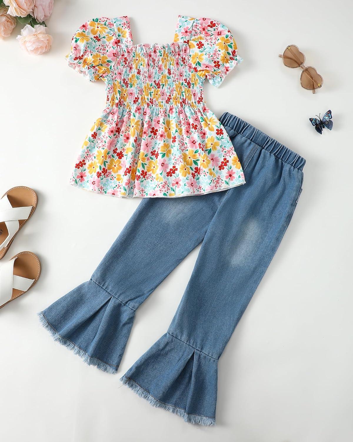 Kucnuzki Kids Toddler Girl Clothes Graphic T Shirt Top Cargo Pants with Pocket 2 Piece Outfit Fall Clothing Set for Girl(Butterfly Jeans)