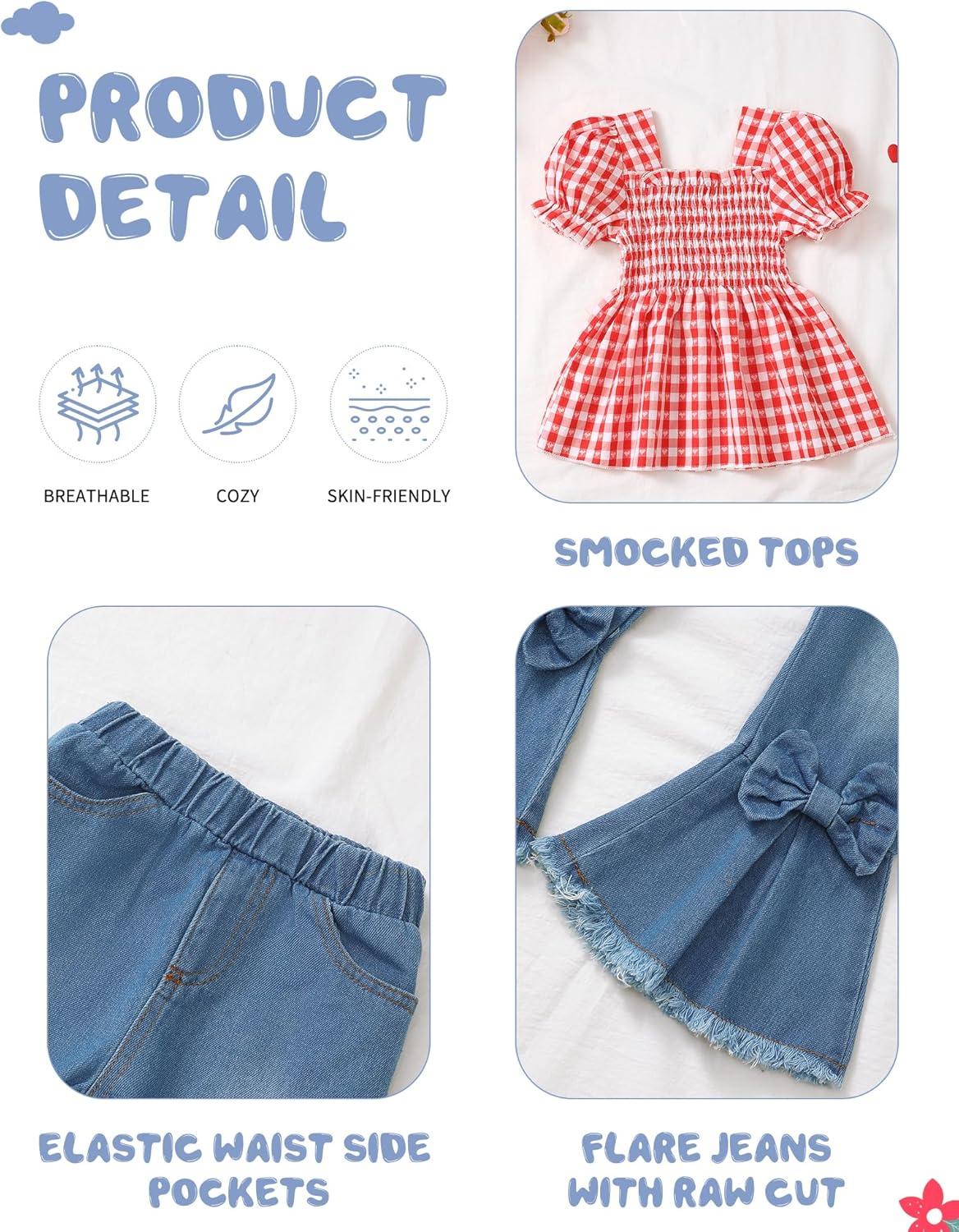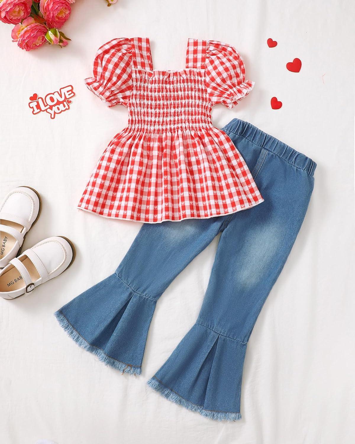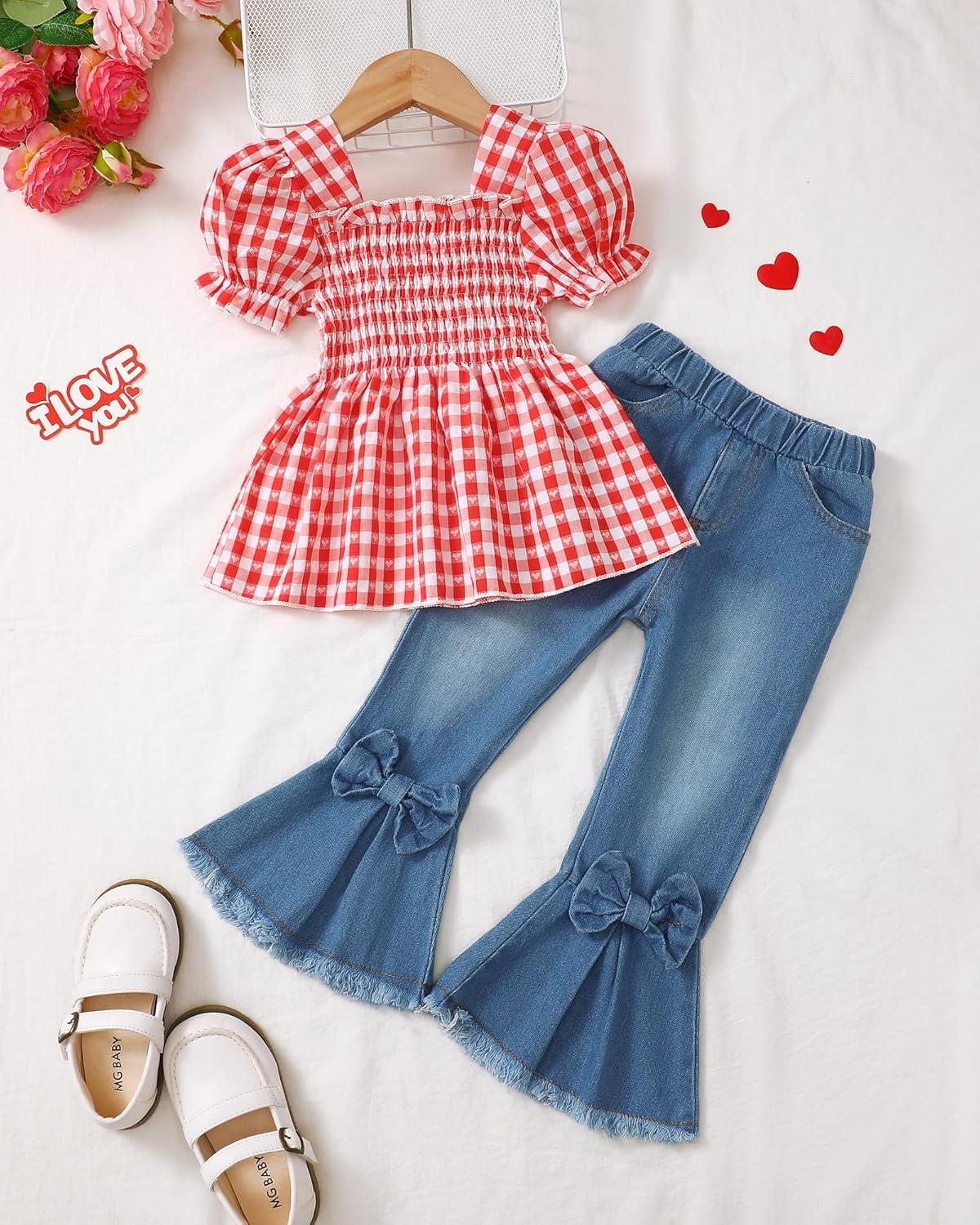Kucnuzki Kids Toddler Girl Clothes Graphic T Shirt Top Cargo Pants with Pocket 2 Piece Outfit Fall Clothing Set for Girl(Plaid Red)