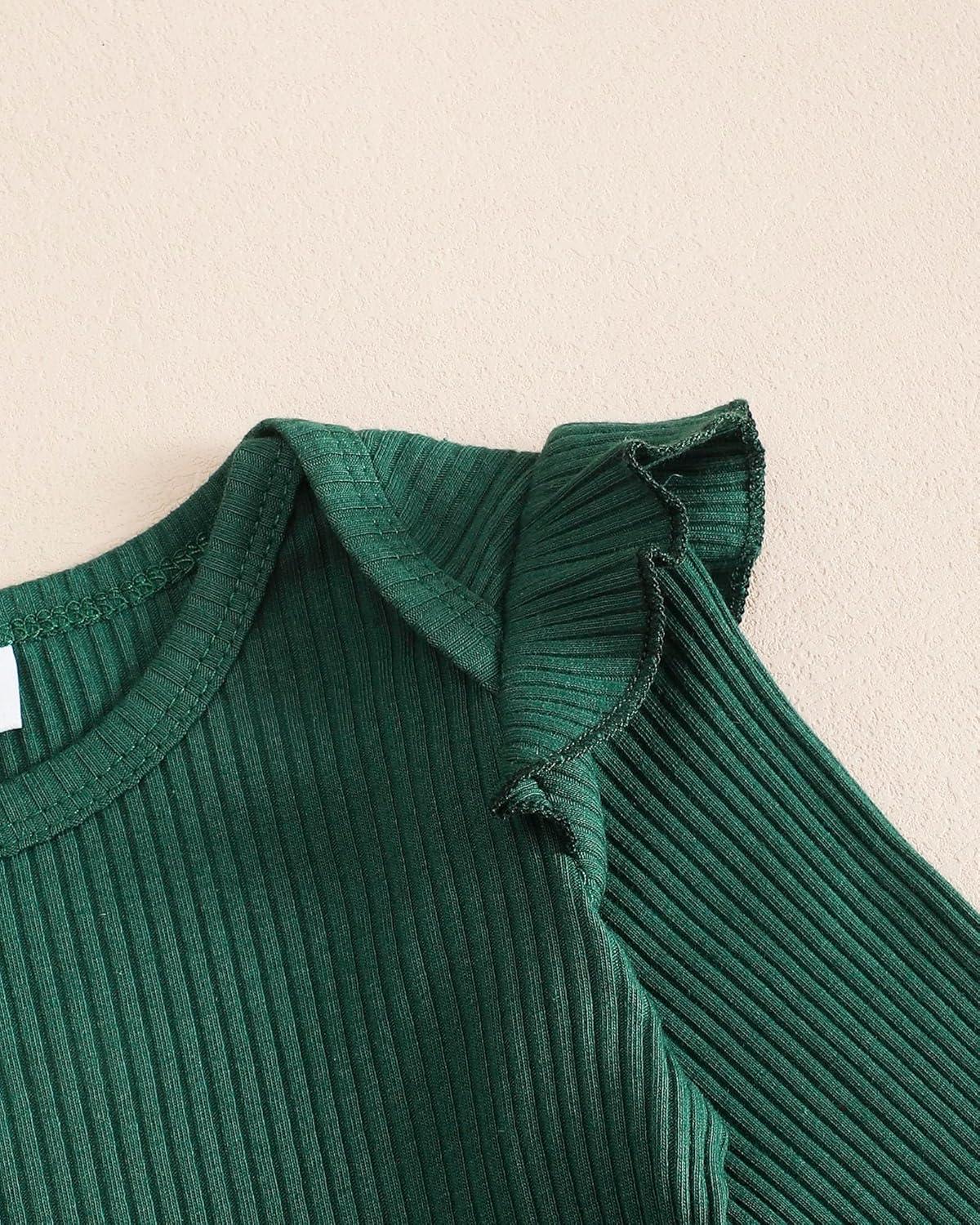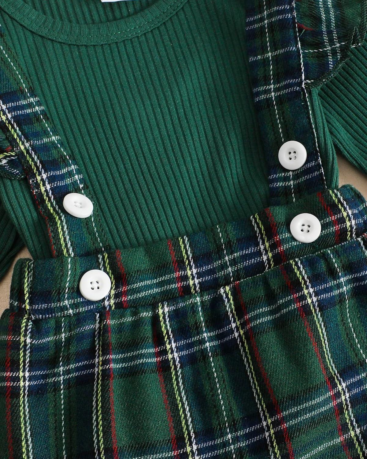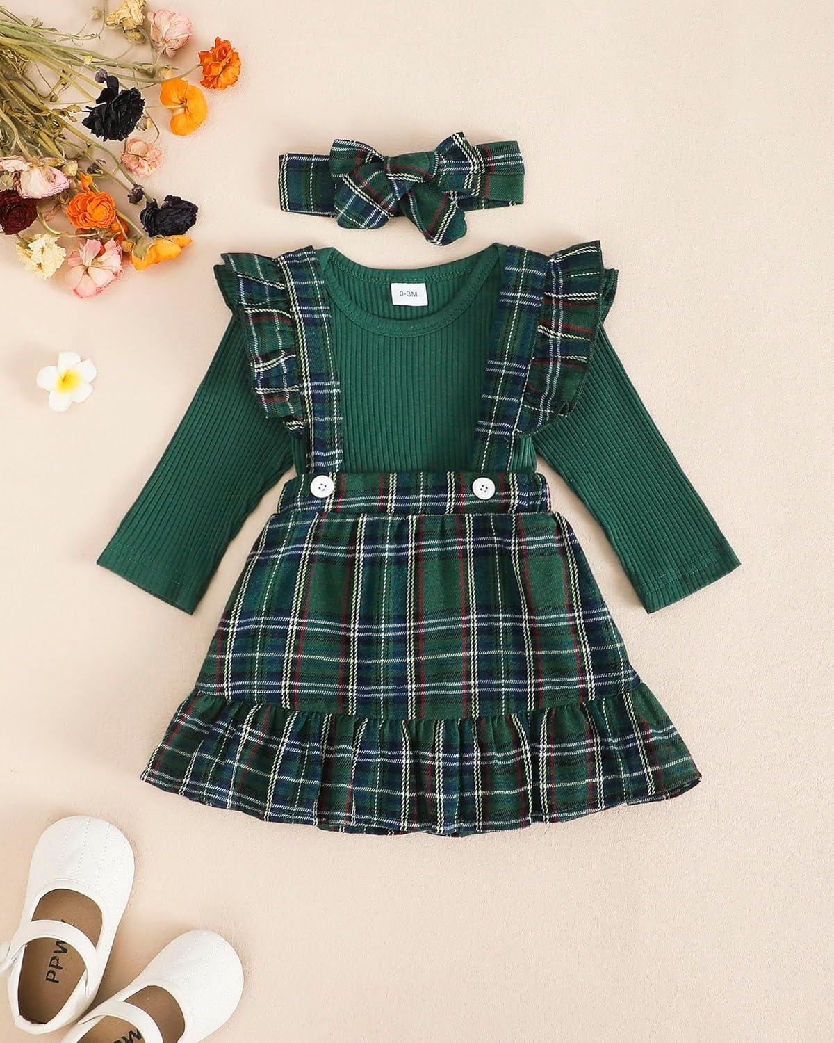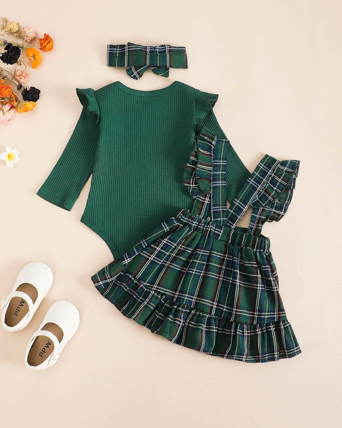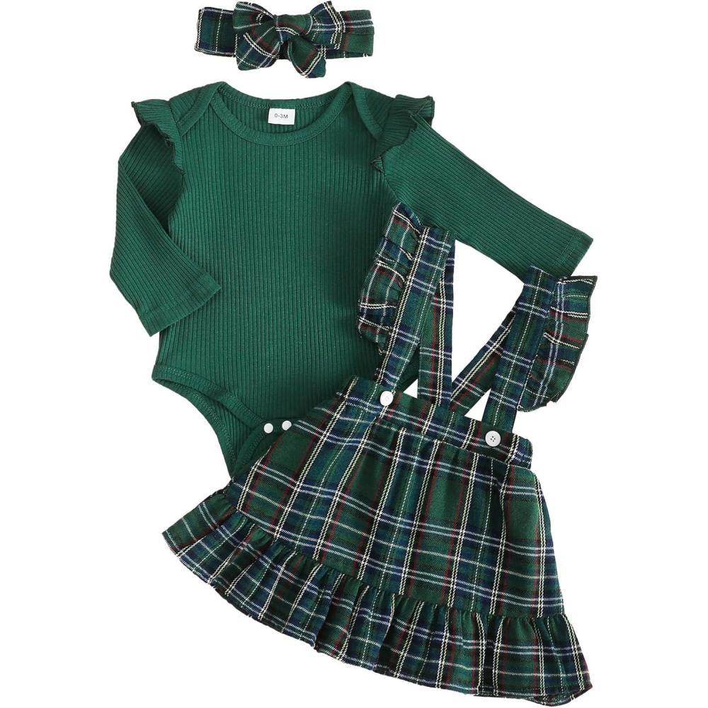 Kucnuzki Newborn Baby Girl Clothes Toddler Long Sleeve Ruffle Romper Top Infant Skirt Set Little Girl Overall Dress(Green Plaid)