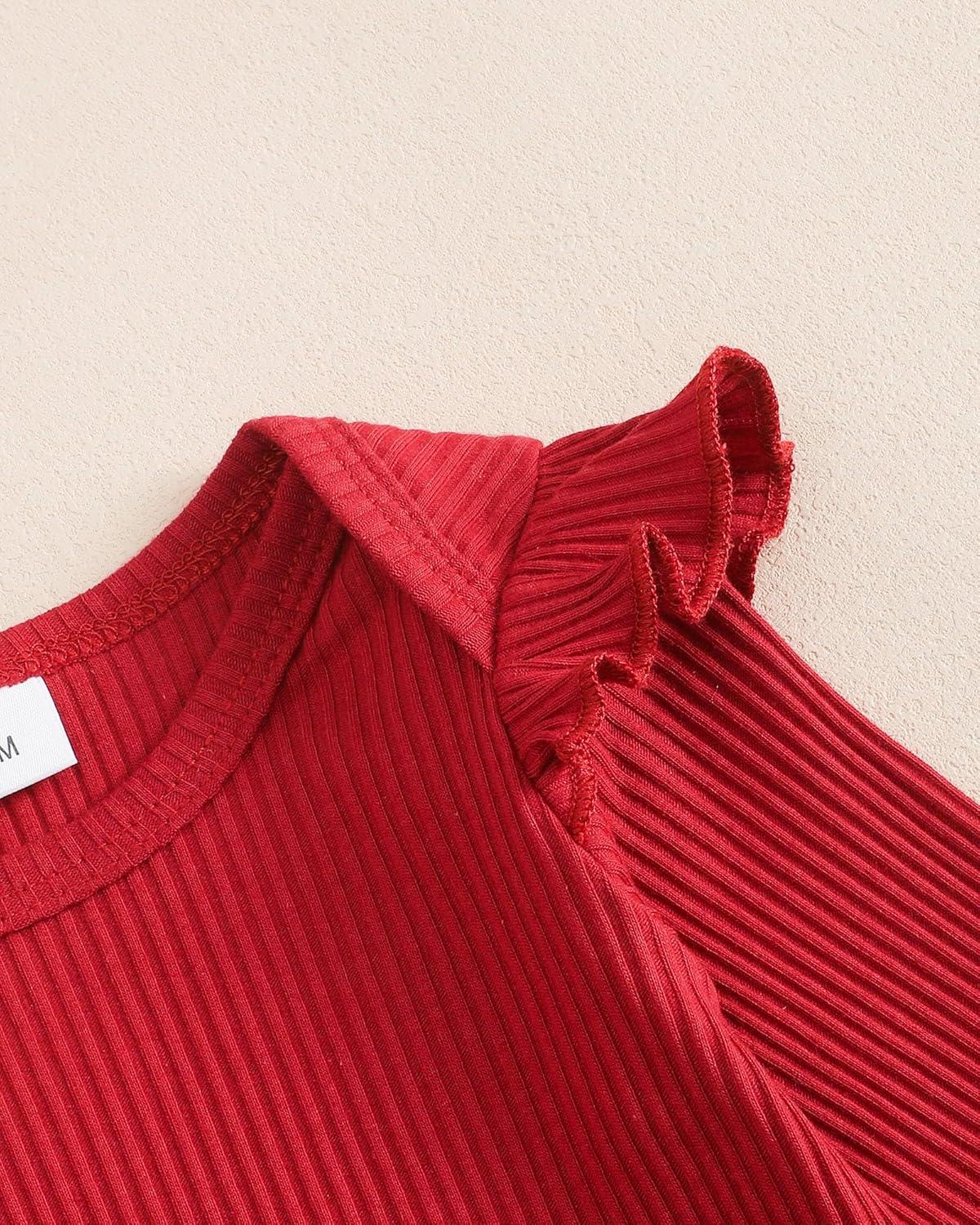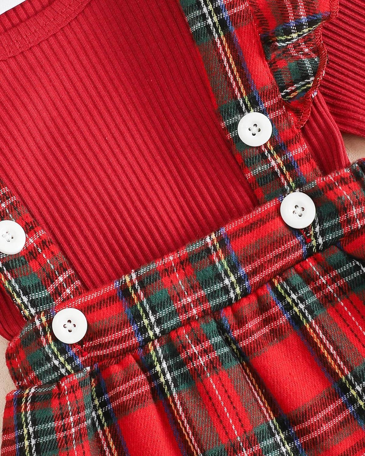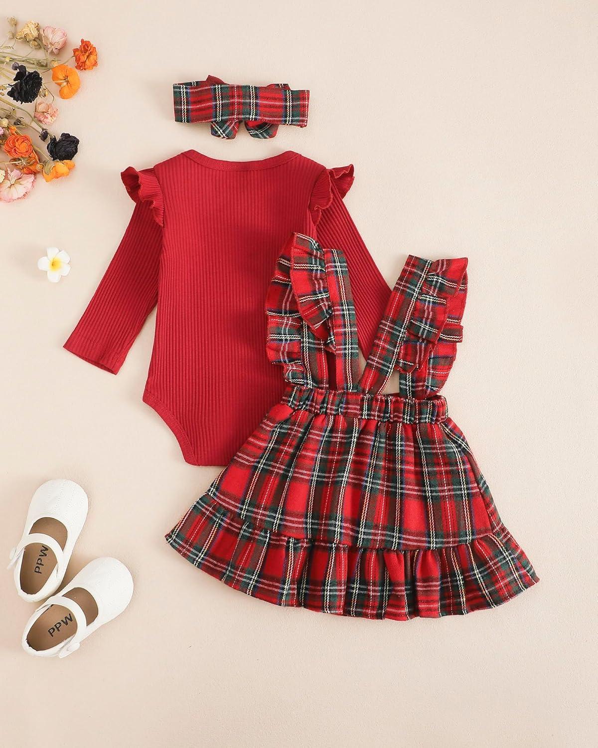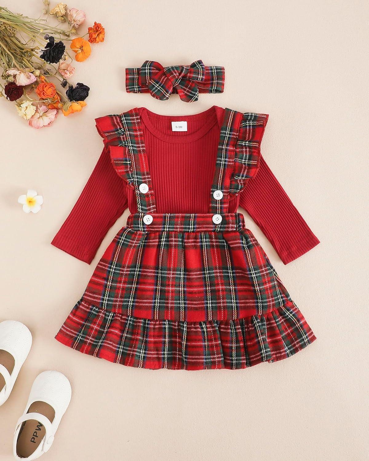 Kucnuzki Newborn Baby Girl Clothes Toddler Long Sleeve Ruffle Romper Top Infant Skirt Set Little Girl Overall Dress(Red Plaid)
