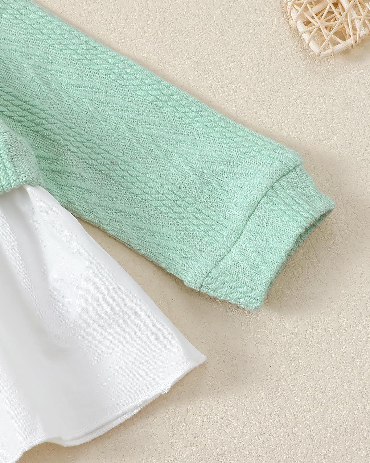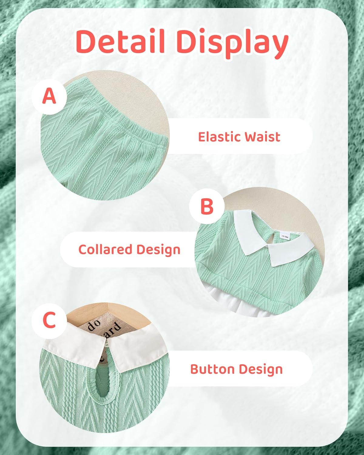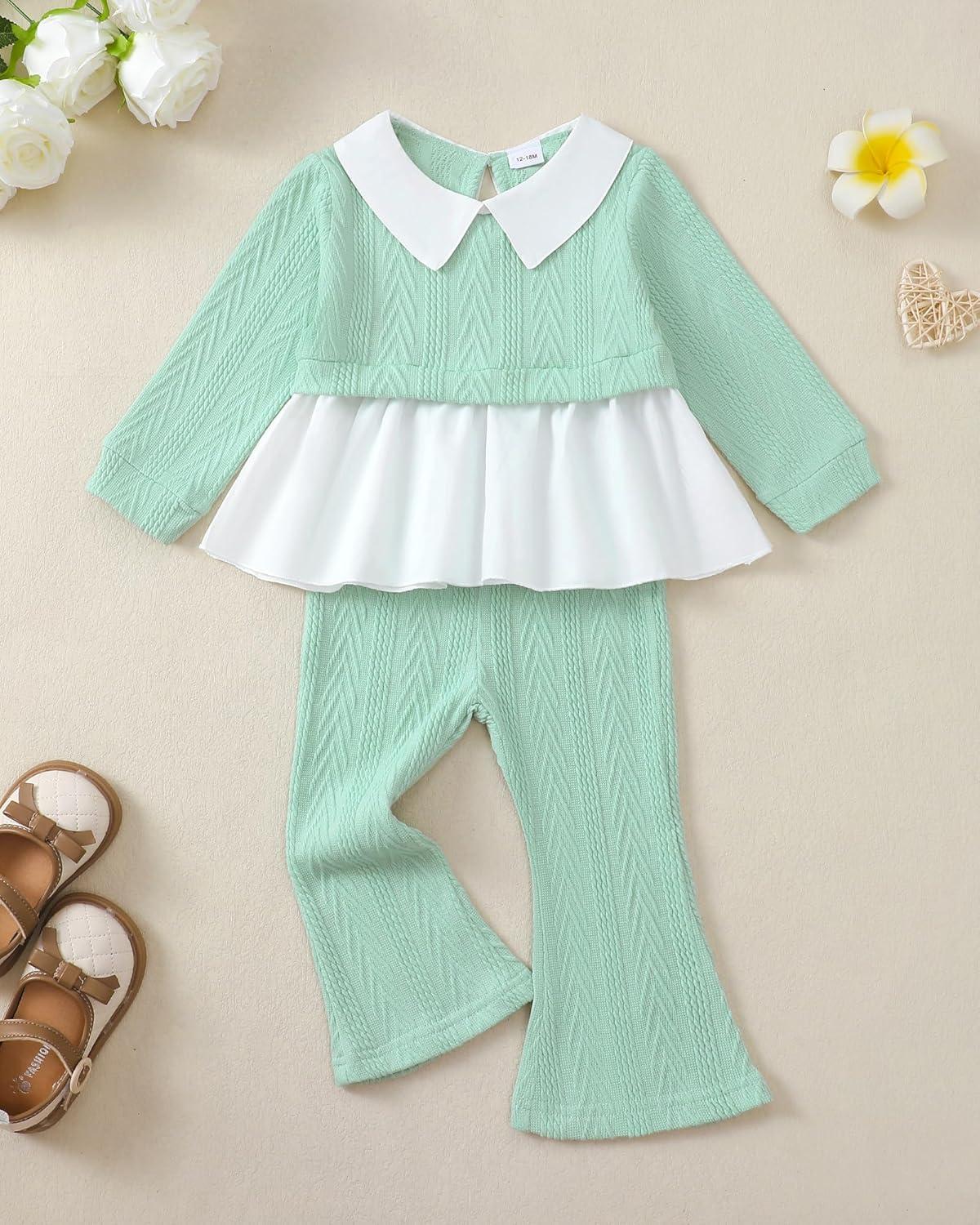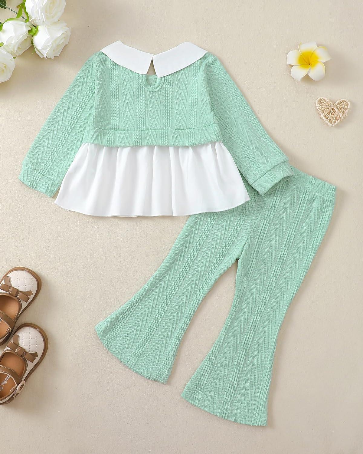 Kucnuzki Toddler Baby Girl Clothes Outfit Long Sleeve Blouse Polo Shirt Top Flare Leggings Pants Two Piece Outfits Set(Green)