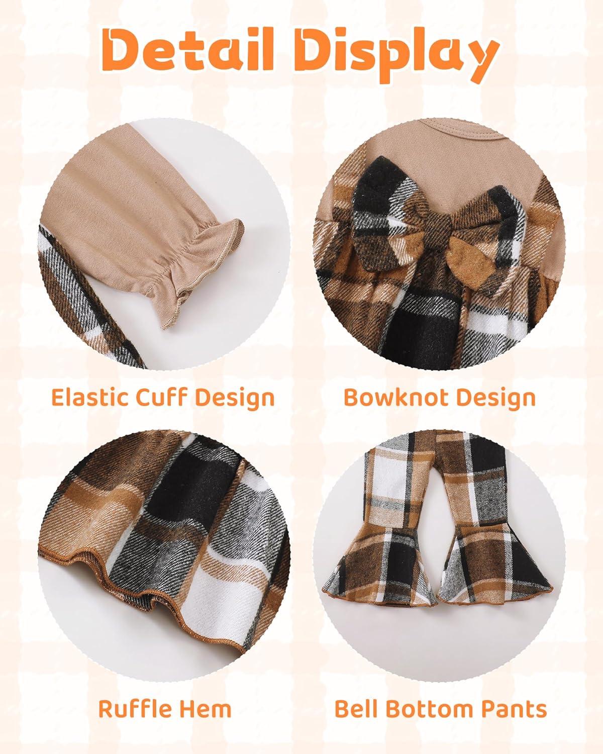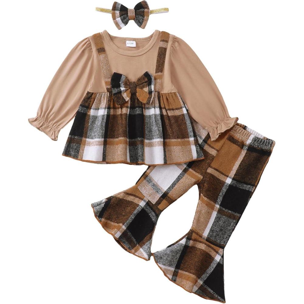 Kucnuzki Toddler Baby Girl Clothes Outfit Long Sleeve Blouse Polo Shirt Top Flare Leggings Pants Two Piece Outfits Set(Khaki Bow)