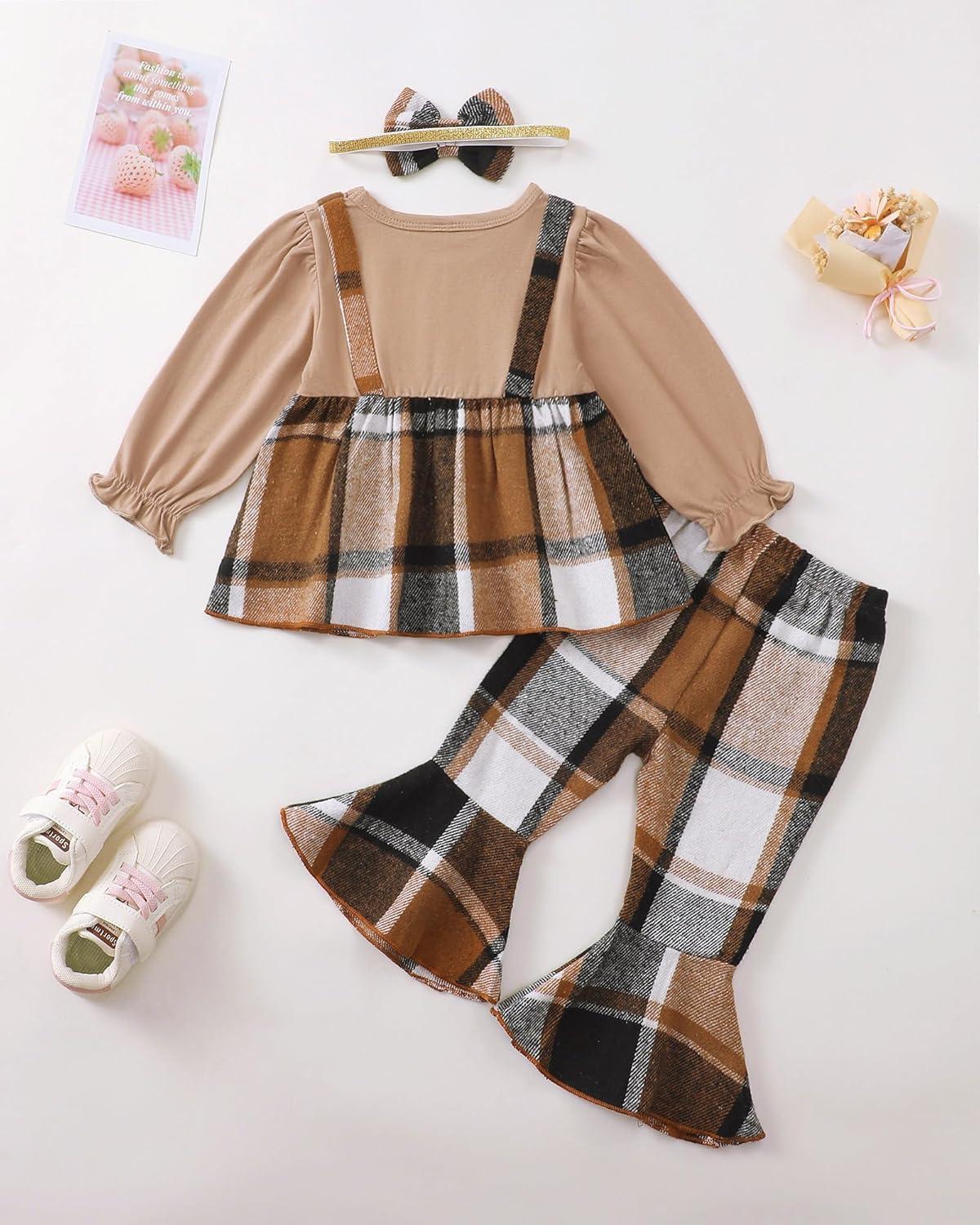 Kucnuzki Toddler Baby Girl Clothes Outfit Long Sleeve Blouse Polo Shirt Top Flare Leggings Pants Two Piece Outfits Set(Khaki)