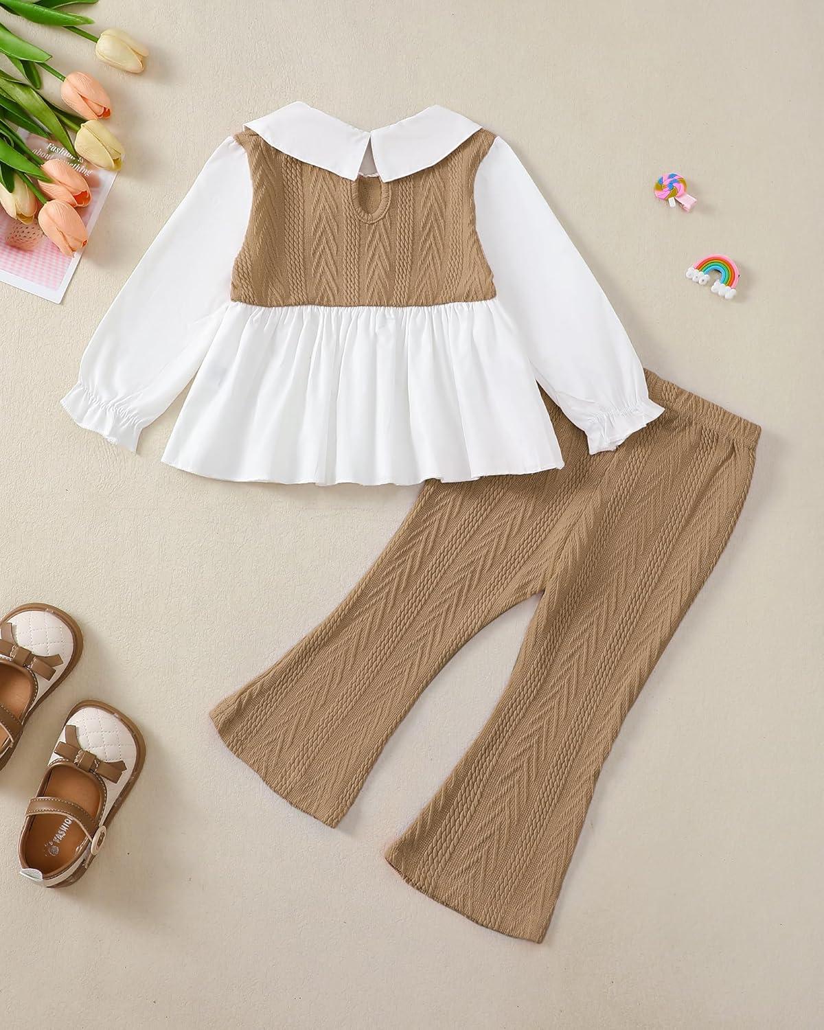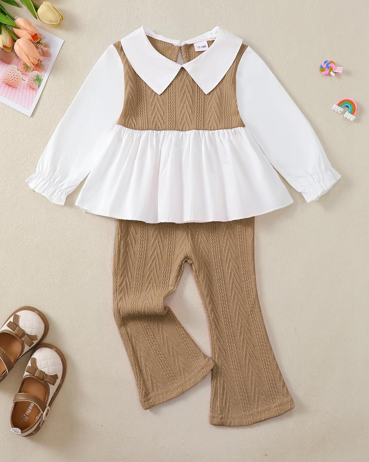 Kucnuzki Toddler Baby Girl Clothes Outfit Long Sleeve Blouse Polo Shirt Top Flare Leggings Pants Two Piece Outfits Set(Khaki)