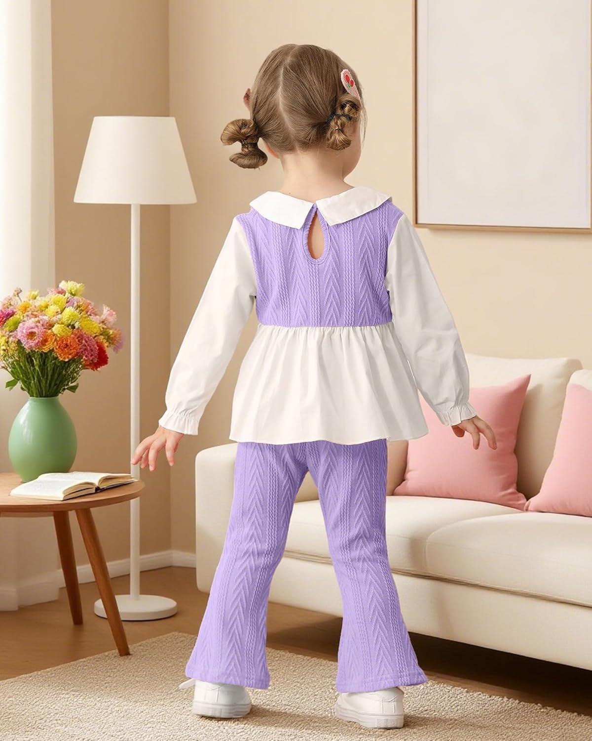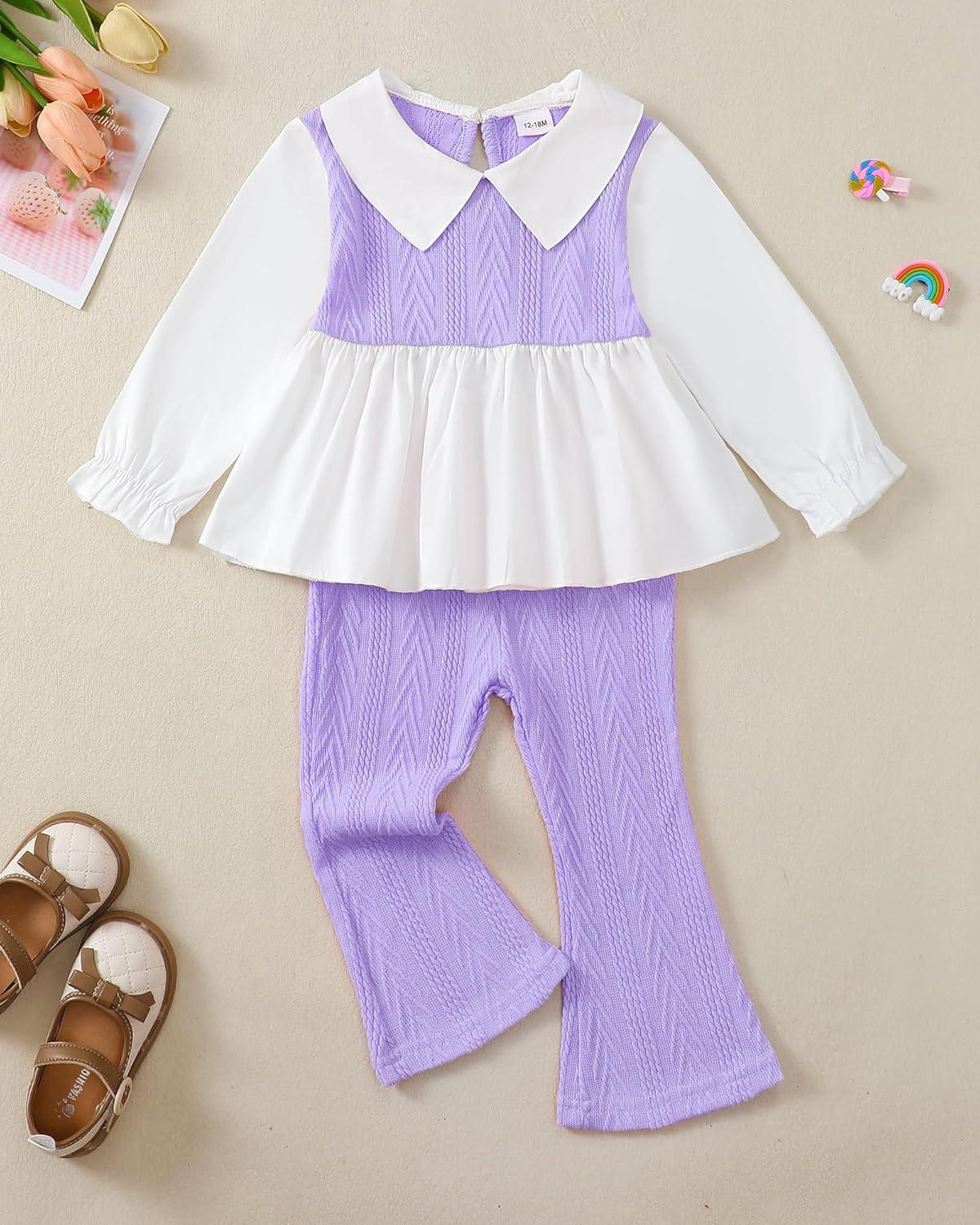 Kucnuzki Toddler Baby Girl Clothes Outfit Long Sleeve Blouse Polo Shirt Top Flare Leggings Pants Two Piece Outfits Set(Purple)