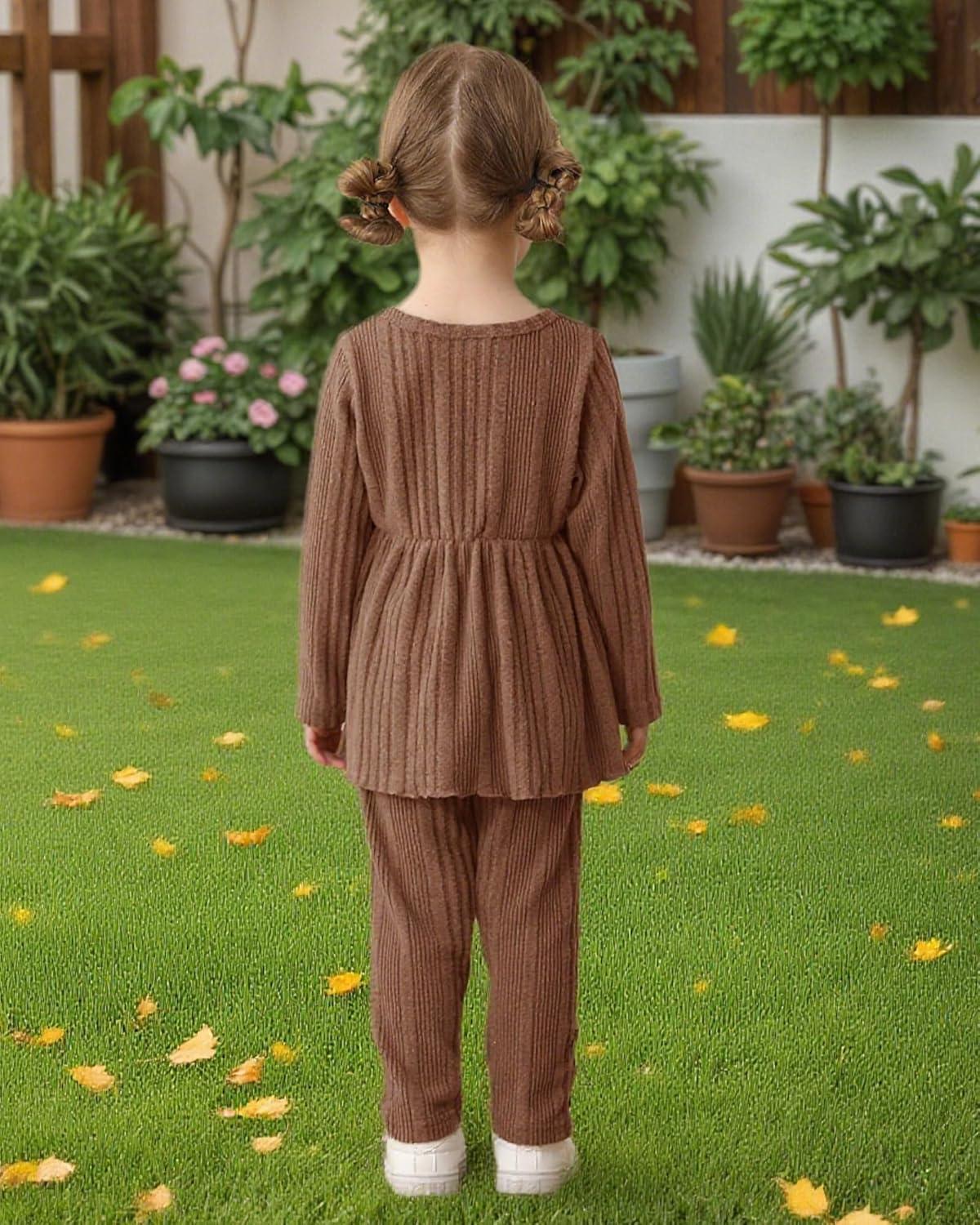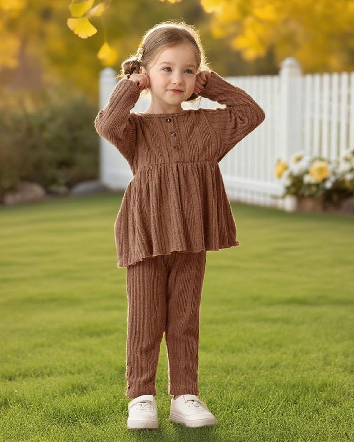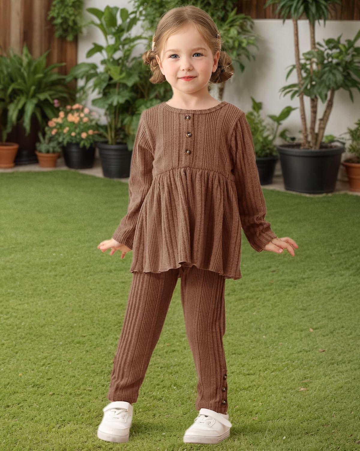 Kucnuzki Toddler Baby Girl Clothes Outfit Long Sleeve Plain T Shirt Top Baby Girl Pants Leggings Two Piece Outfits Set(Brown)