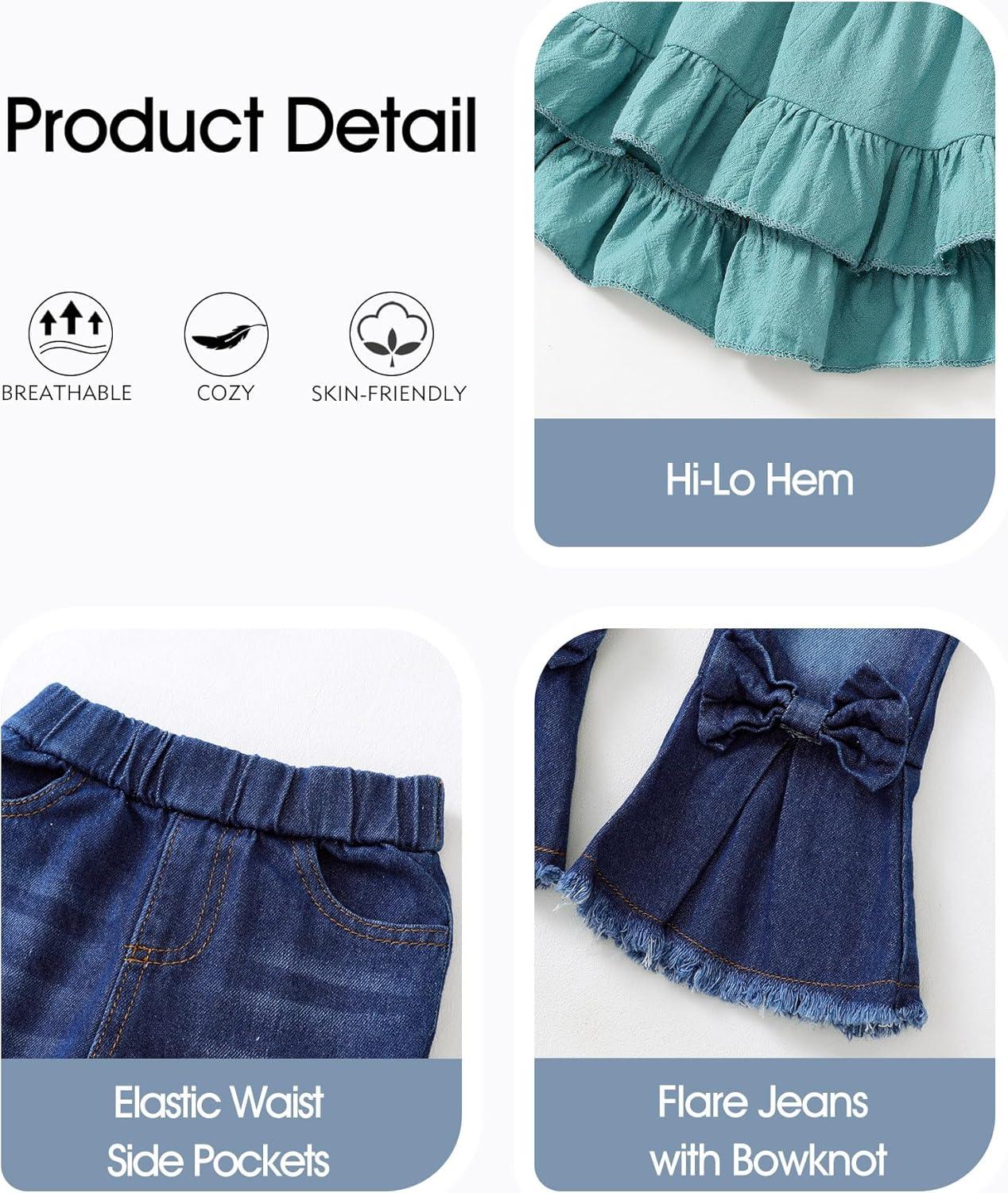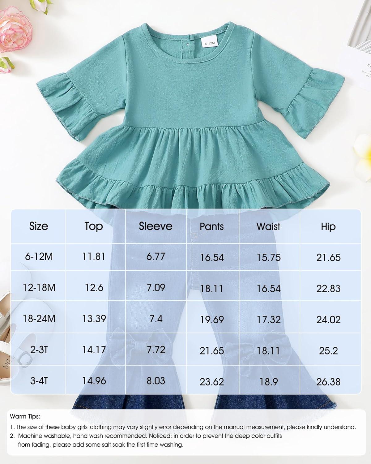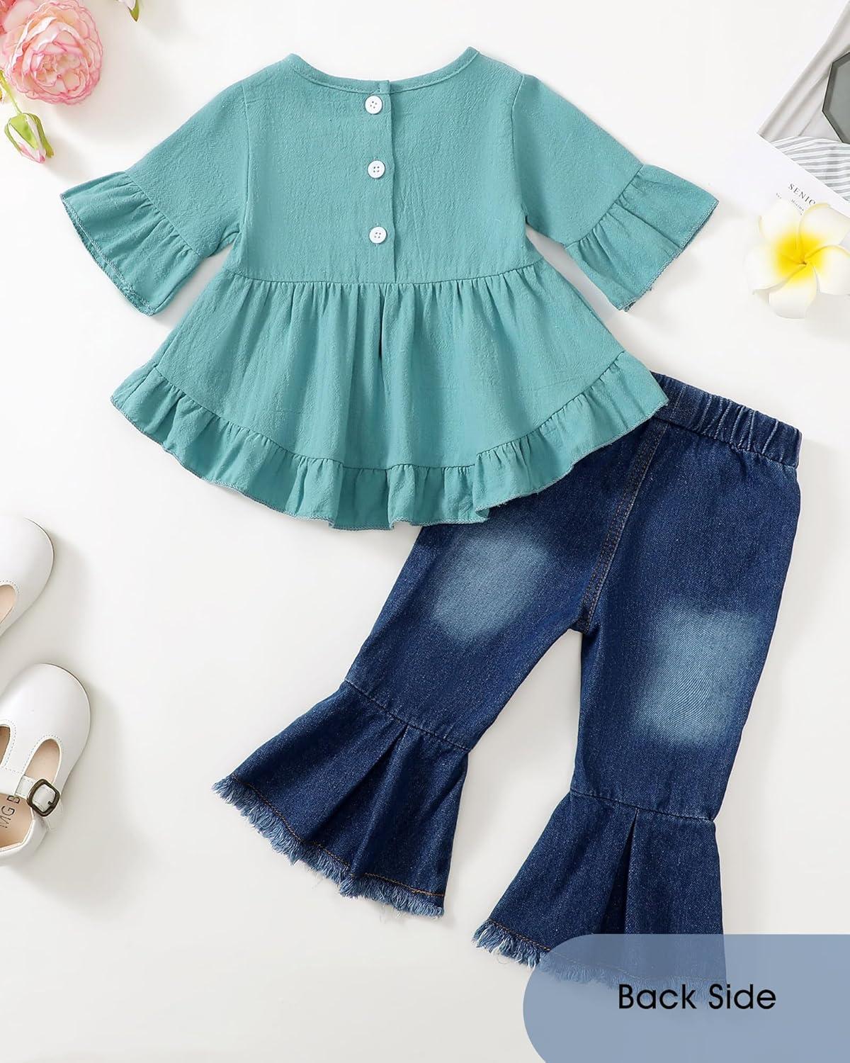 Kucnuzki Toddler Baby Girls Clothes Long Sleeve Shirt Top Flare Denim Jeans Cute Outfit Baby Girl Fall Winter Clothes(Blue-sl)