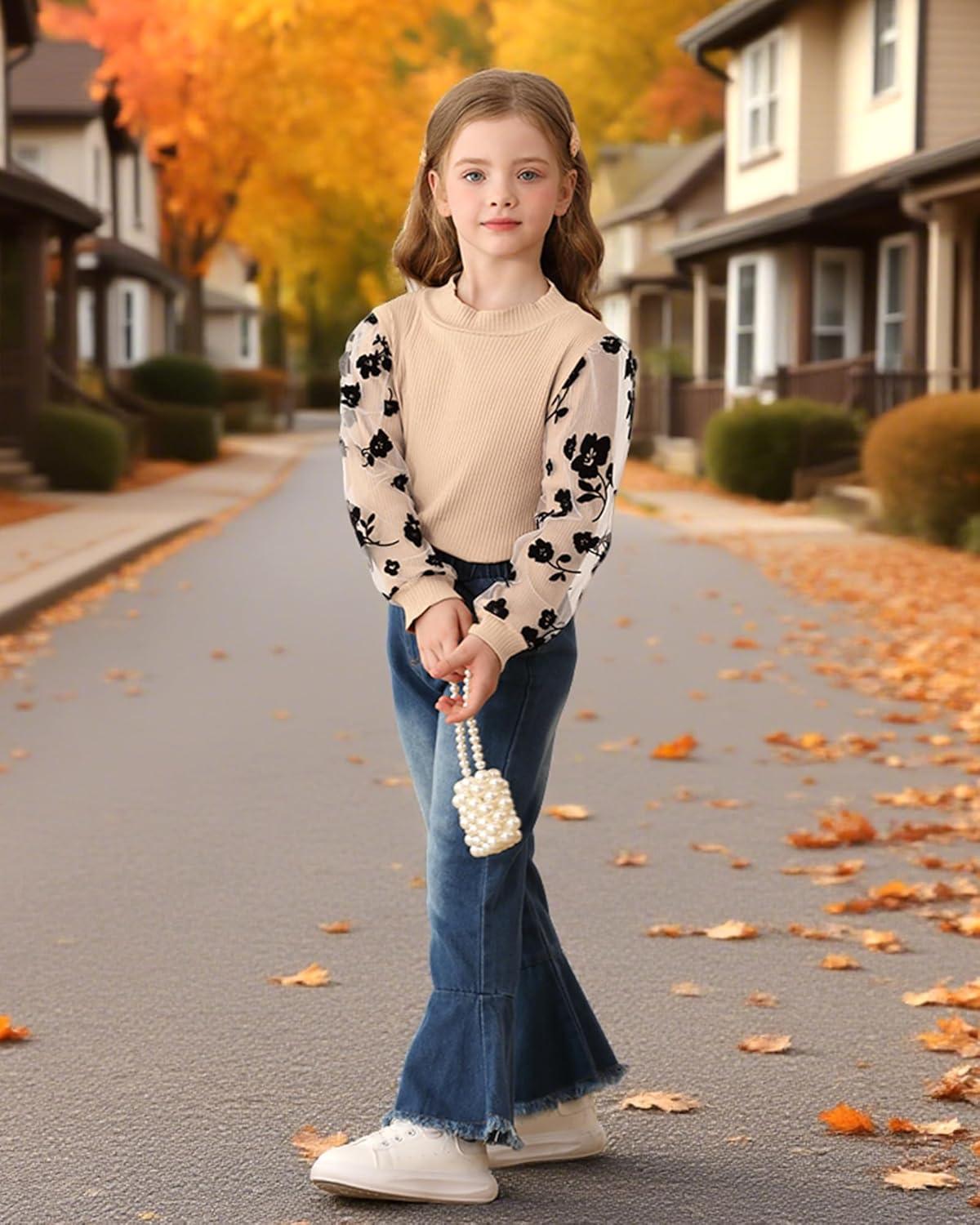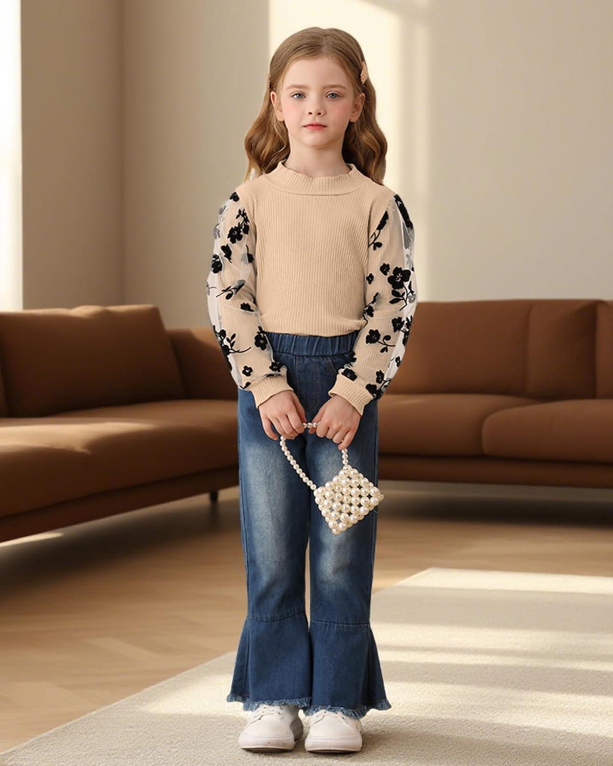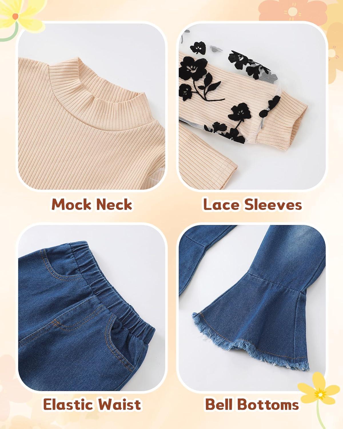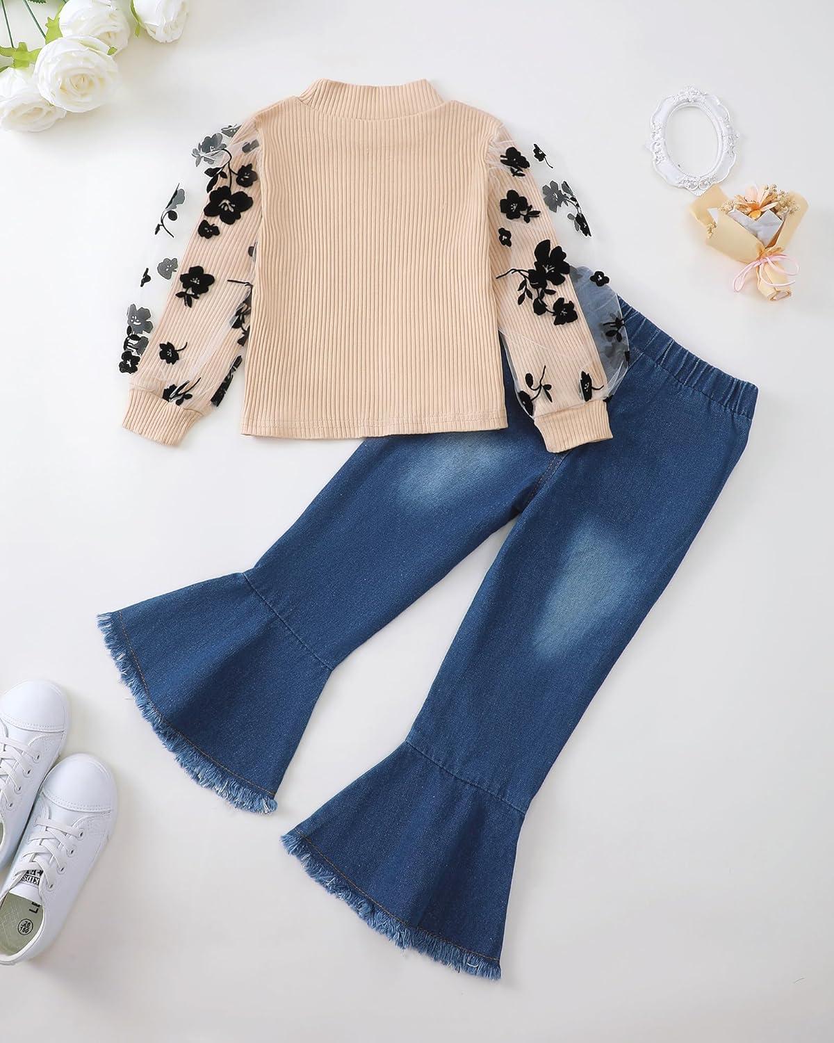 Kucnuzki Toddler Girl Clothes Cute Kids Clothes Long Sleeve T Shirts Top Bell Bottom Denim Jeans Pants Matching Outfits(Apricot)