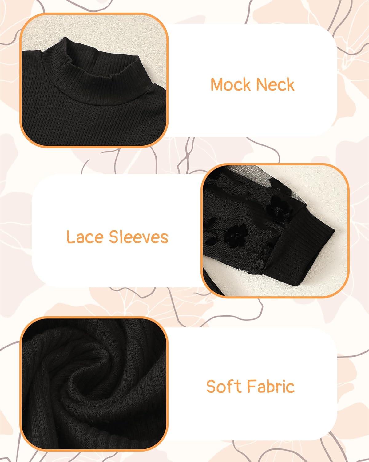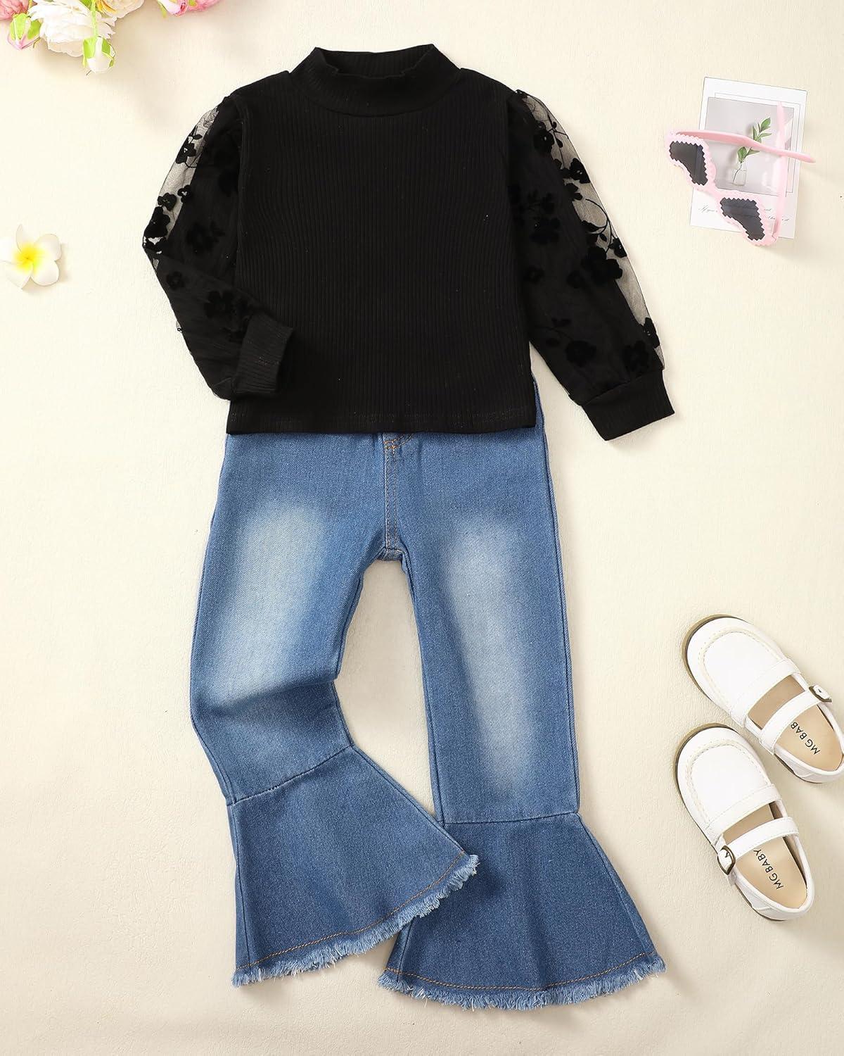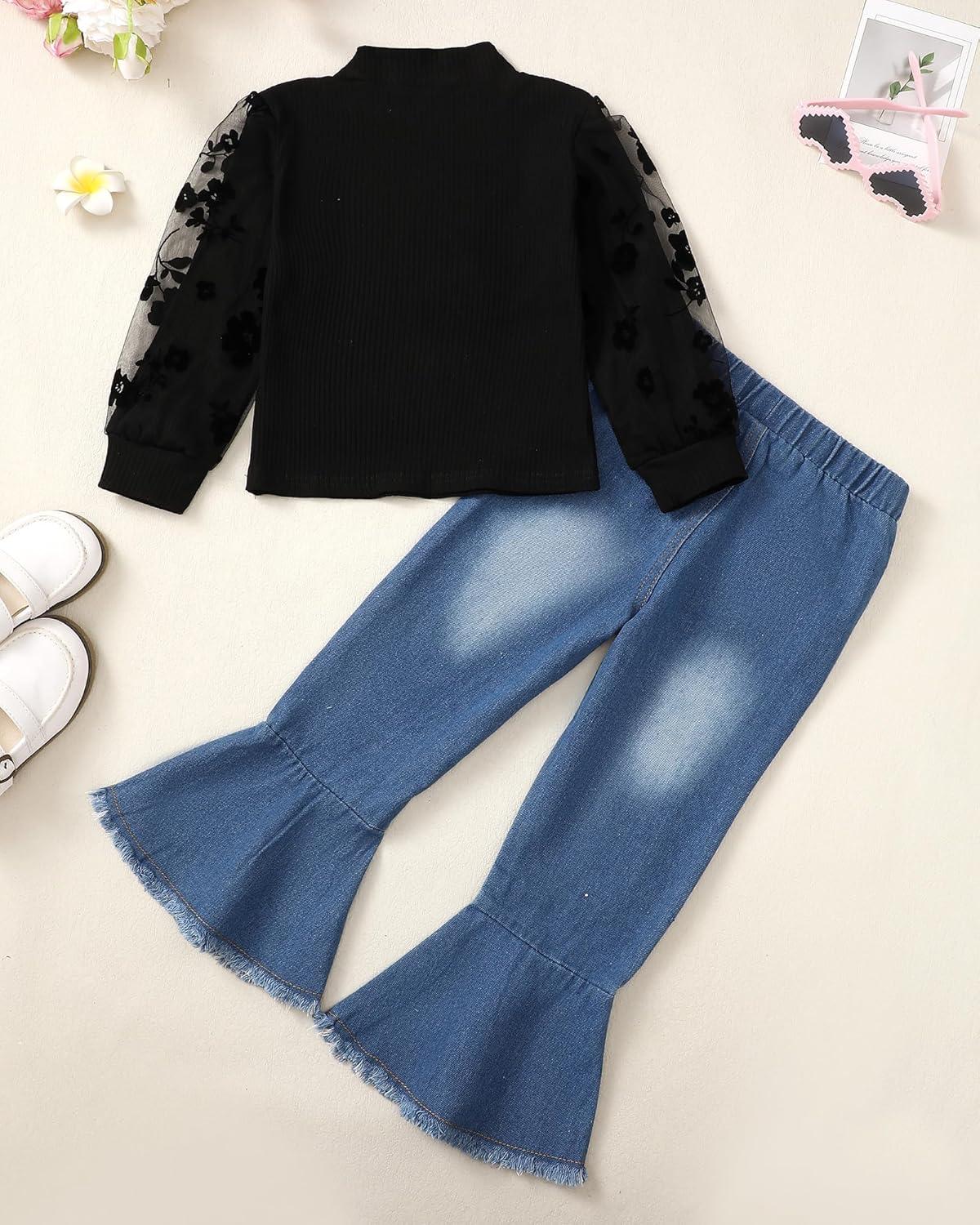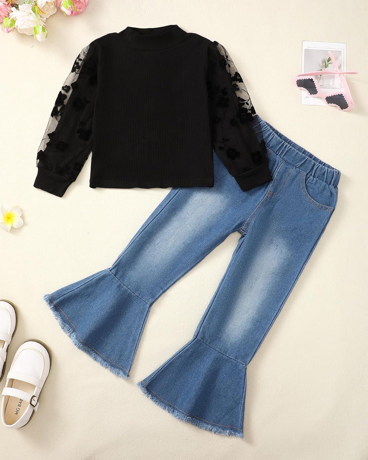 Kucnuzki Toddler Girl Clothes Cute Kids Clothes Long Sleeve T Shirts Top Bell Bottom Denim Jeans Pants Matching Outfits(Black)