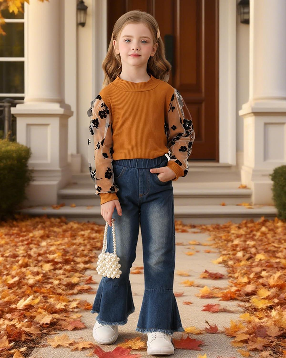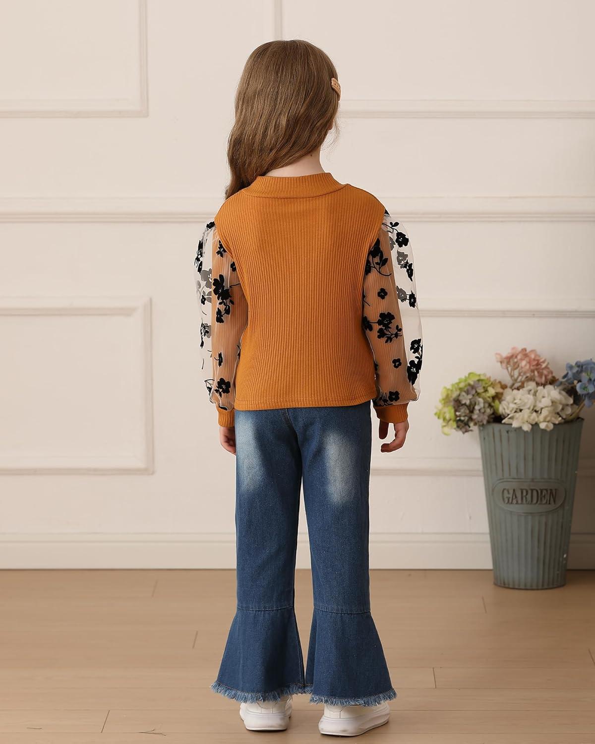 Kucnuzki Toddler Girl Clothes Cute Kids Clothes Long Sleeve T Shirts Top Bell Bottom Denim Jeans Pants Matching Outfits(Brown)