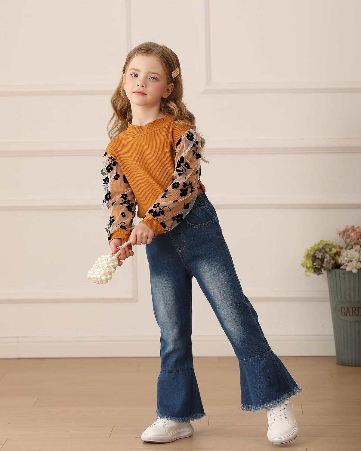 Kucnuzki Toddler Girl Clothes Cute Kids Clothes Long Sleeve T Shirts Top Bell Bottom Denim Jeans Pants Matching Outfits(Dark Brown)