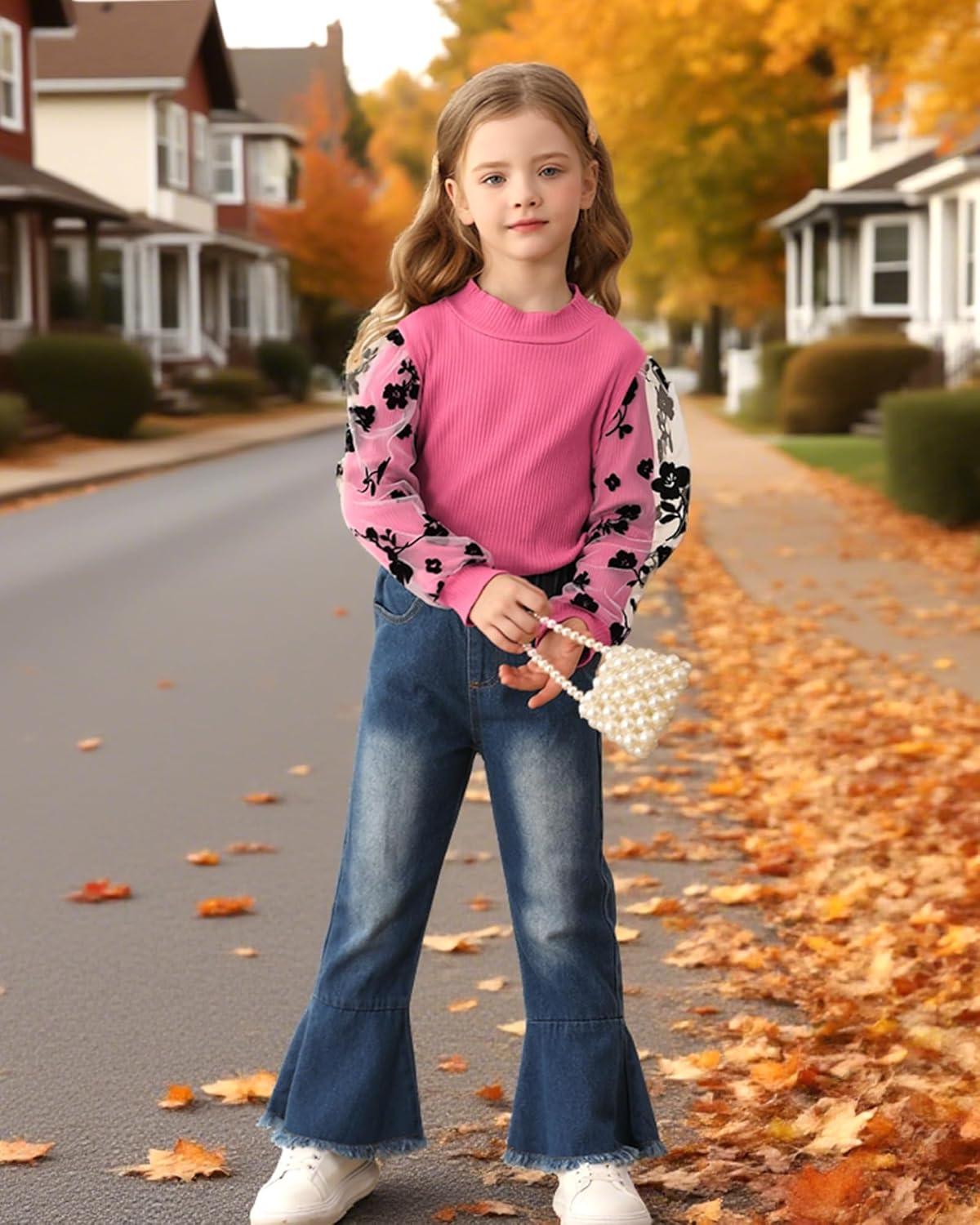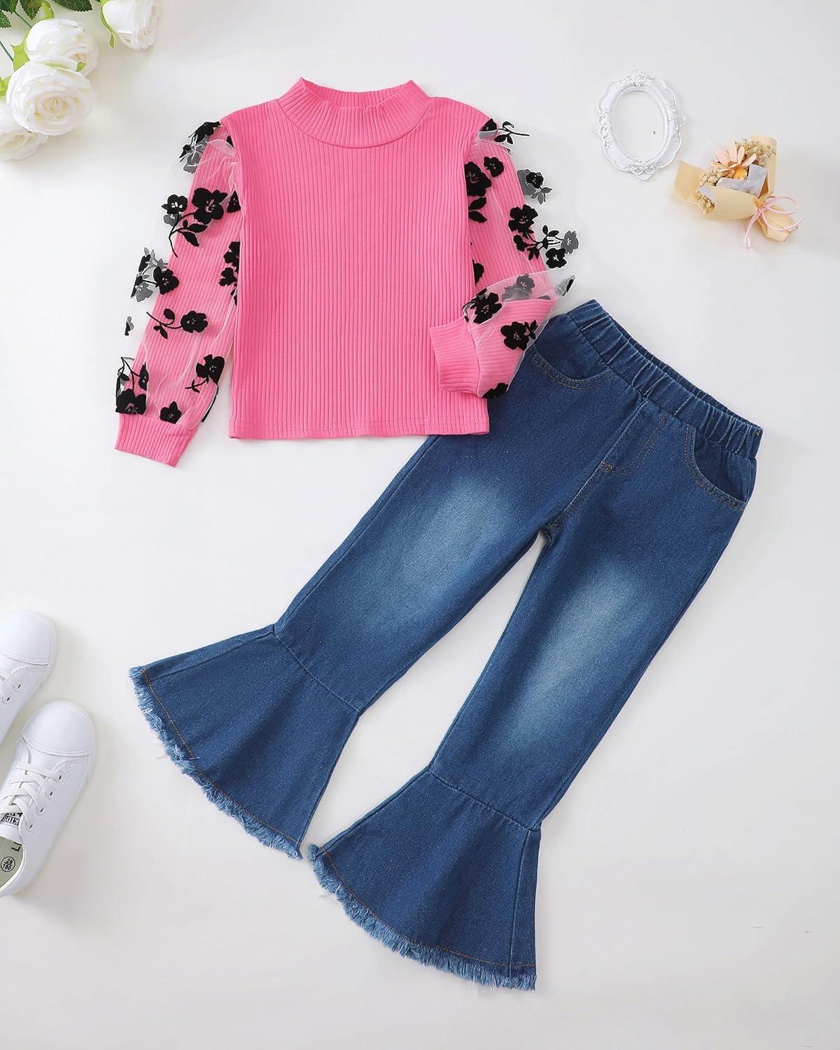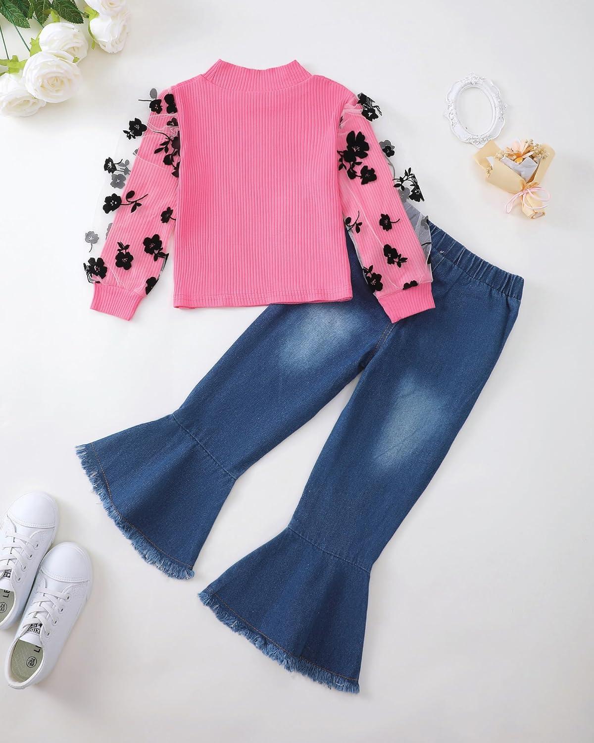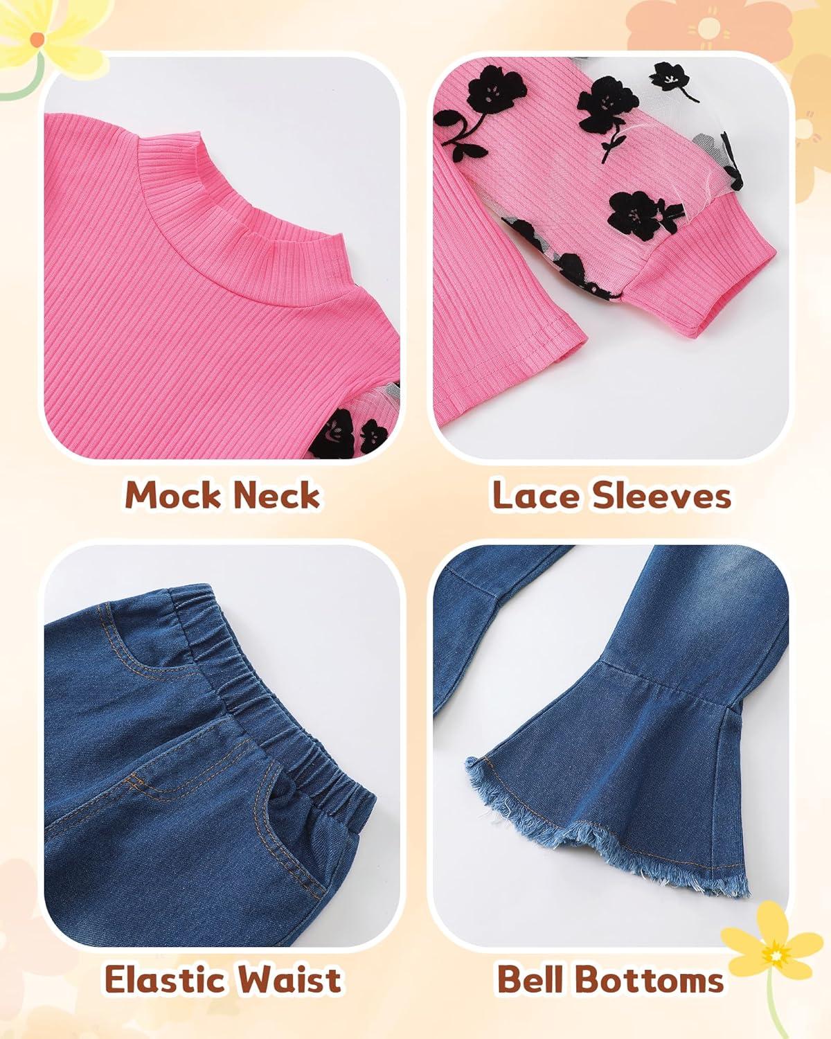 Kucnuzki Toddler Girl Clothes Cute Kids Clothes Long Sleeve T Shirts Top Bell Bottom Denim Jeans Pants Matching Outfits(Rose-lace)
