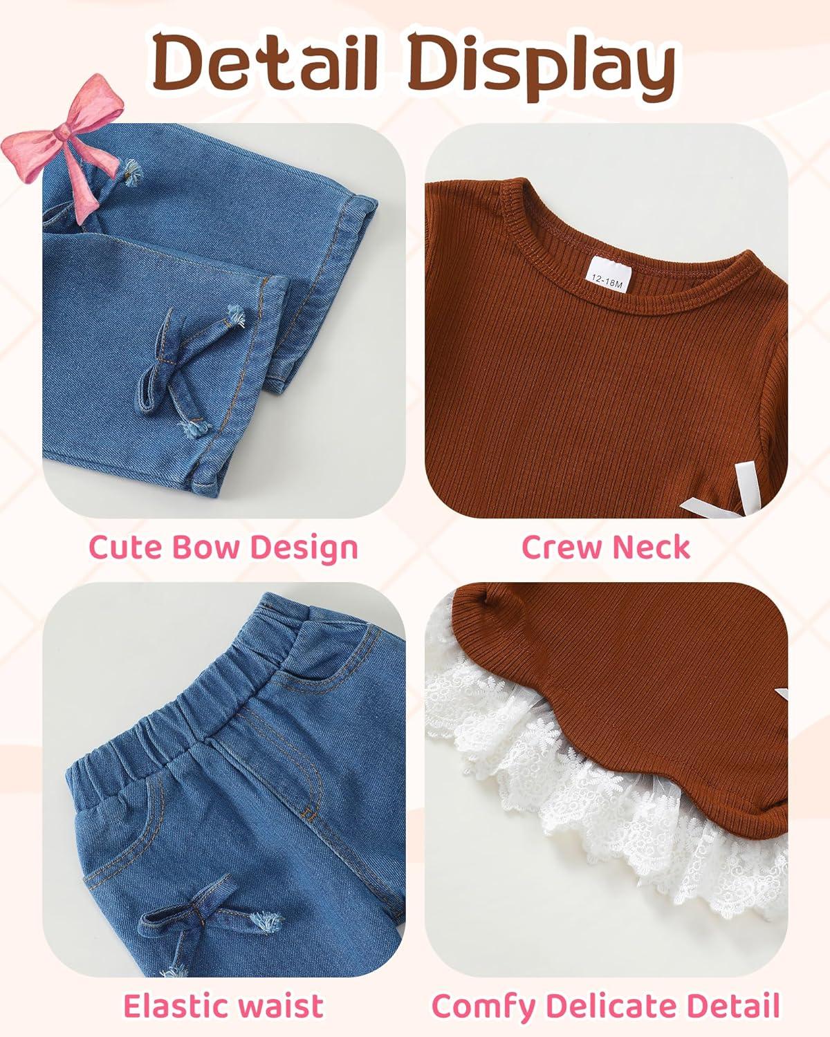 Kucnuzki Toddler Kids Girl Clothes Long Sleeve Shirt Tops Baggy Jeans Cute Pants Set Baby Girl Outfit 2 Piece Clothing(Brown)