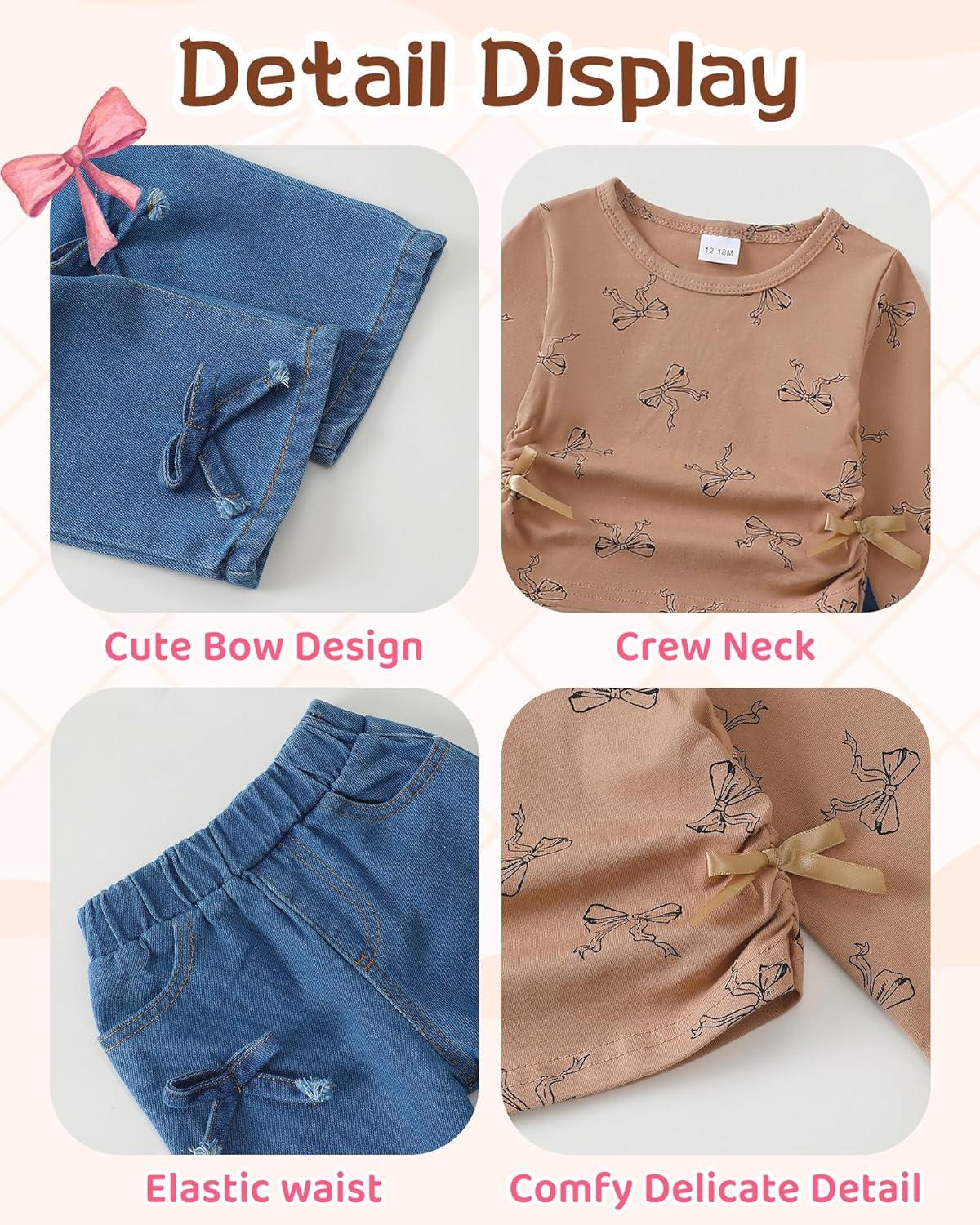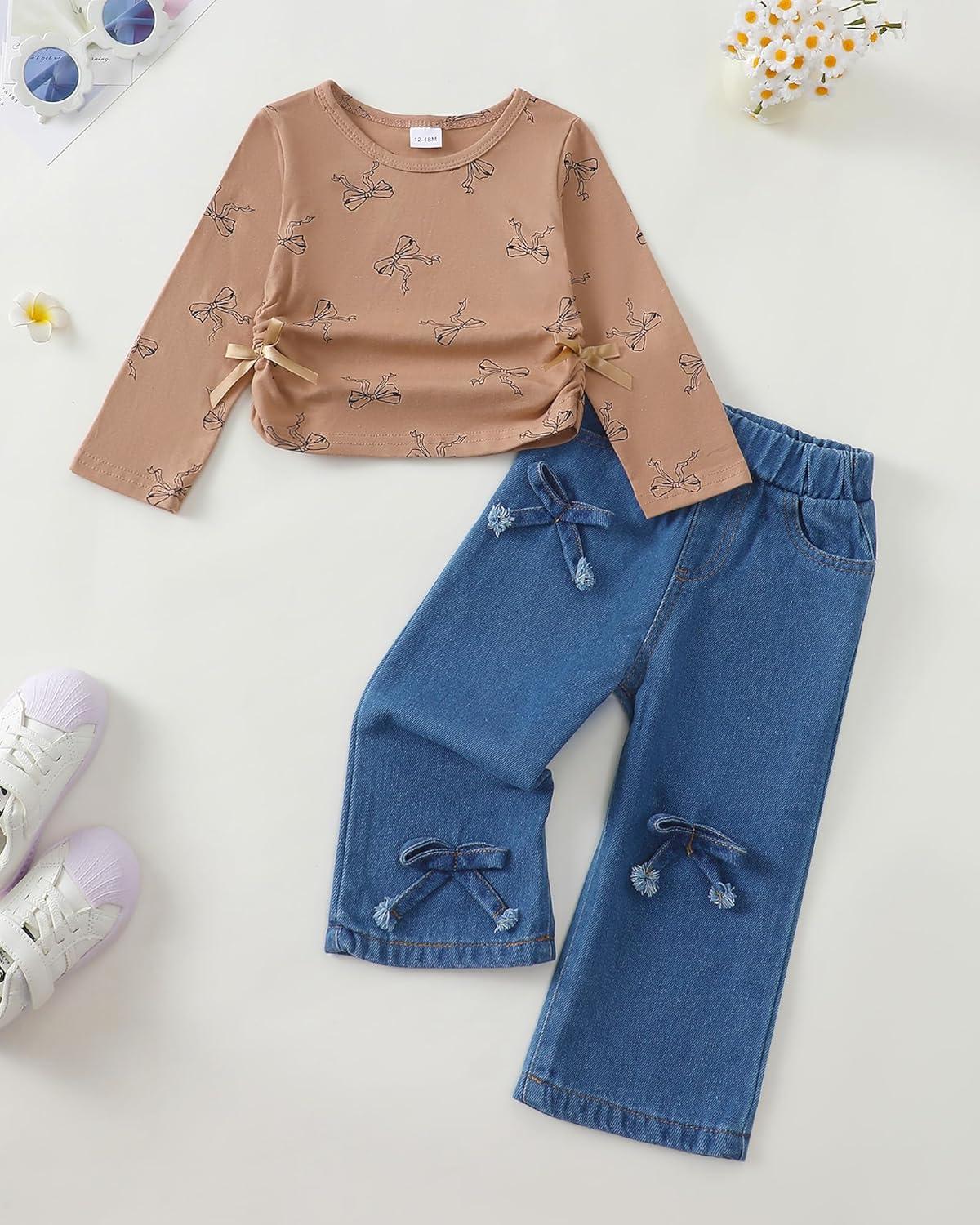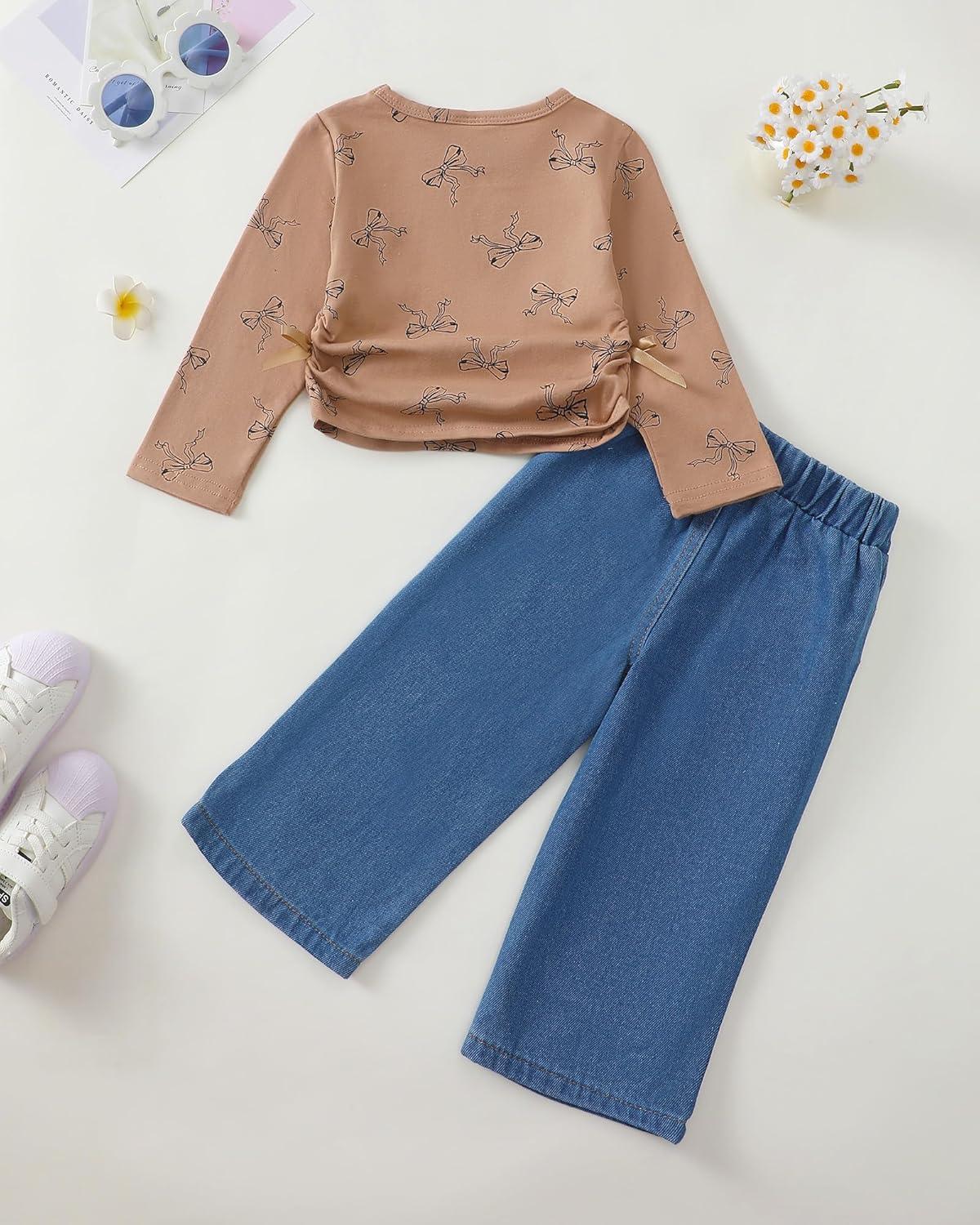 Kucnuzki Toddler Kids Girl Clothes Long Sleeve Shirt Tops Baggy Jeans Cute Pants Set Baby Girl Outfit 2 Piece Clothing(Brown)