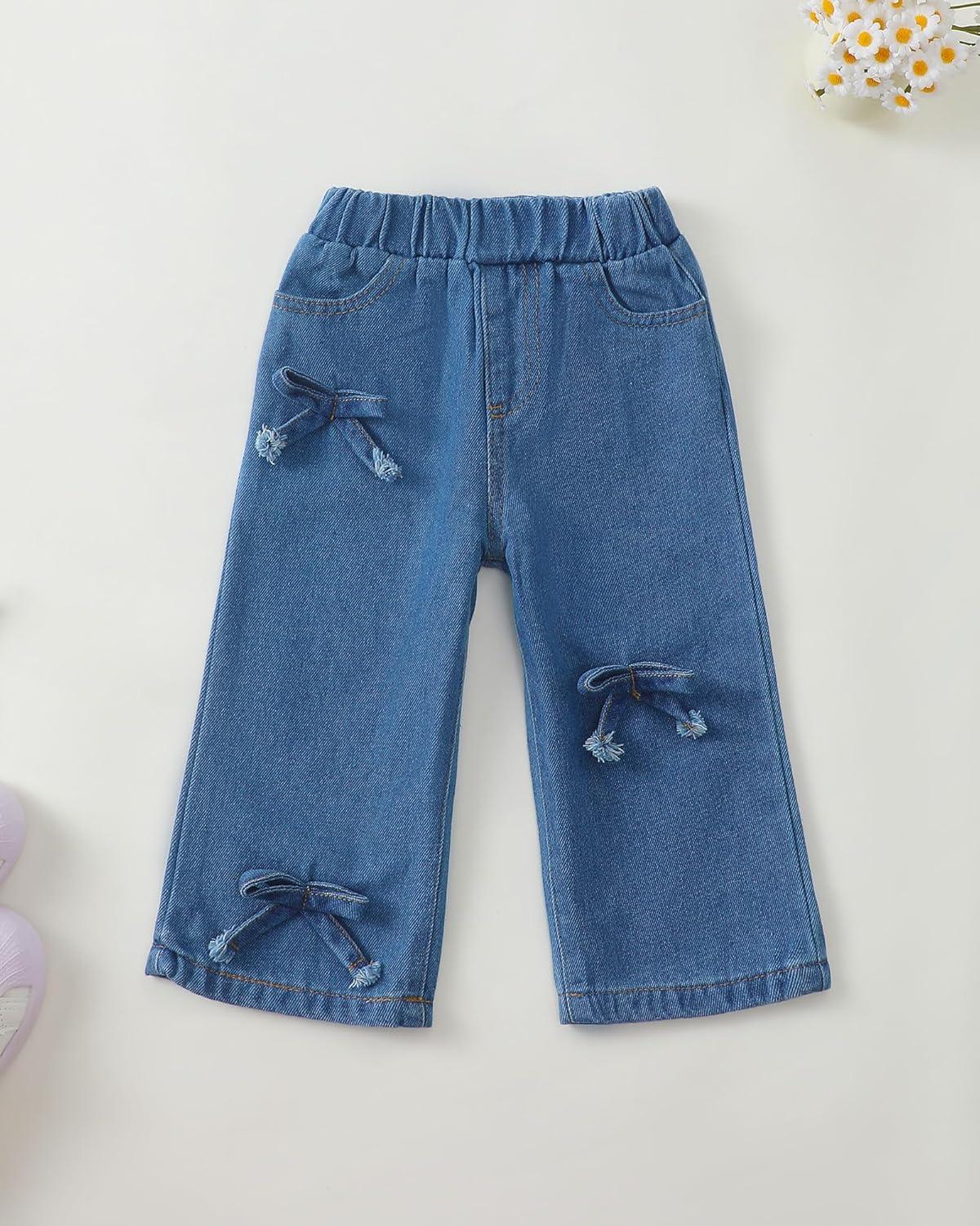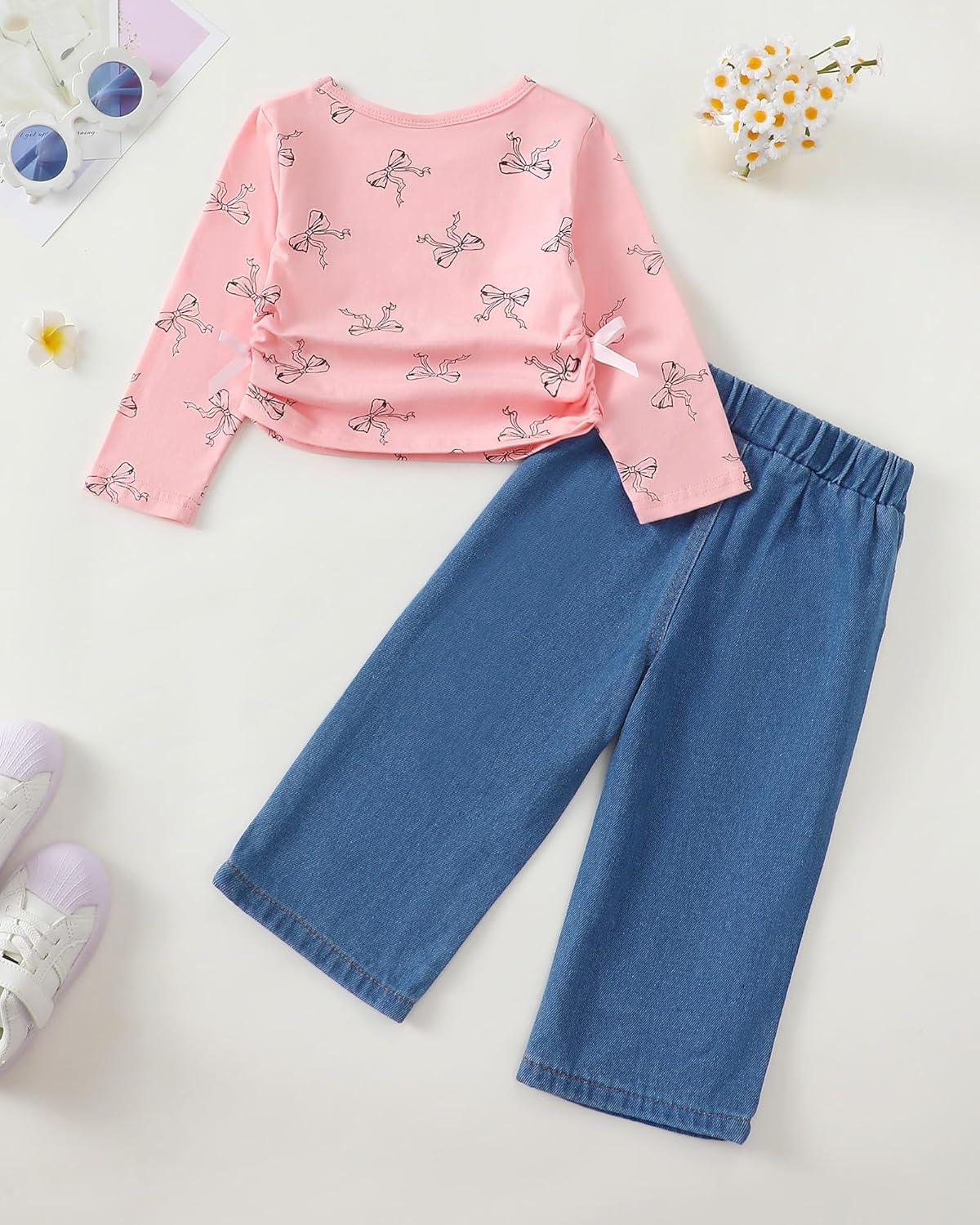 Kucnuzki Toddler Kids Girl Clothes Long Sleeve Shirt Tops Baggy Jeans Cute Pants Set Baby Girl Outfit 2 Piece Clothing(Pink White)