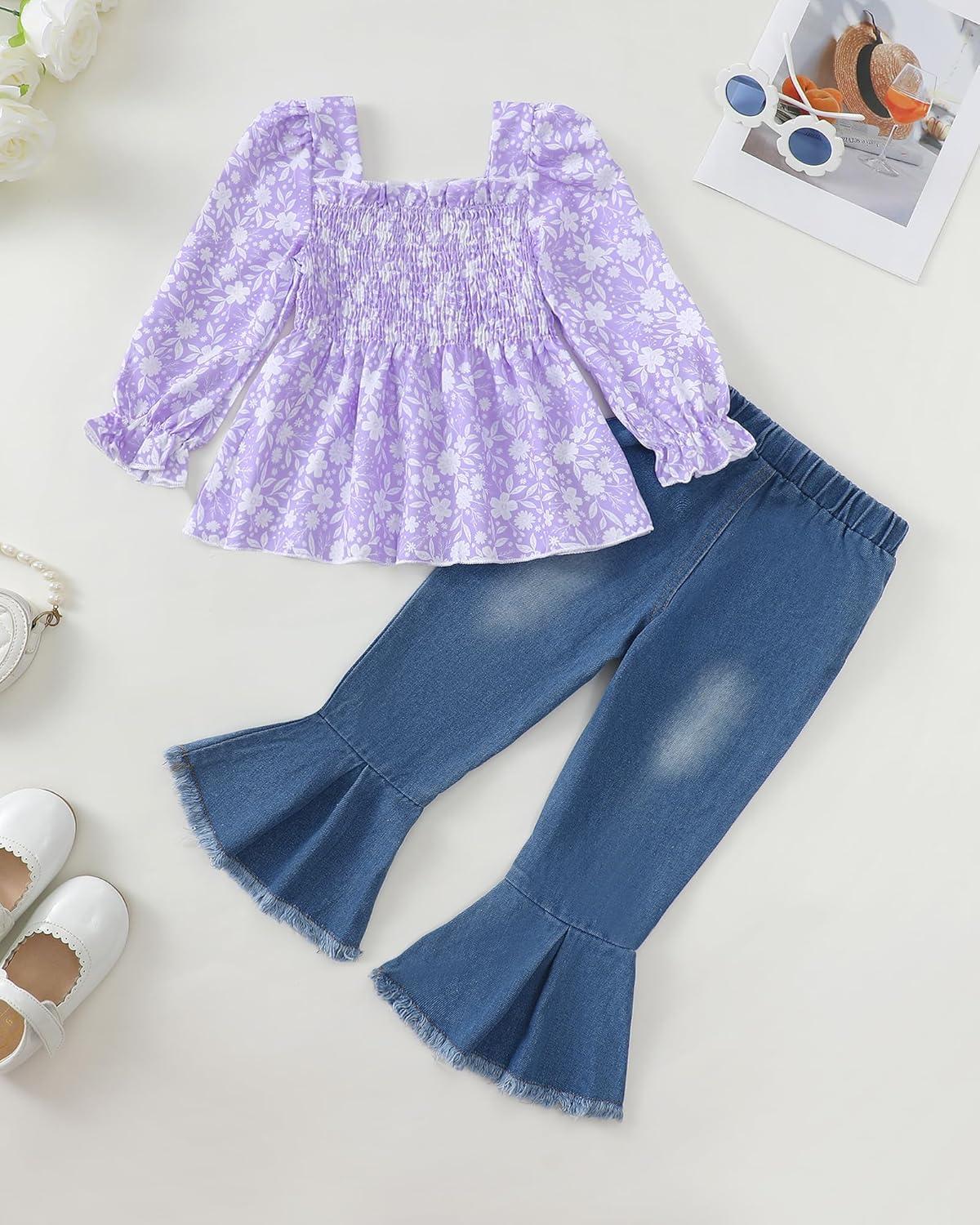 Kucnuzki Toddler Kids Girl Clothes Long Sleeve Shirt Tops Baggy Jeans Cute Pants Set Baby Girl Outfit 2 Piece Clothing(Purple Flower-l)